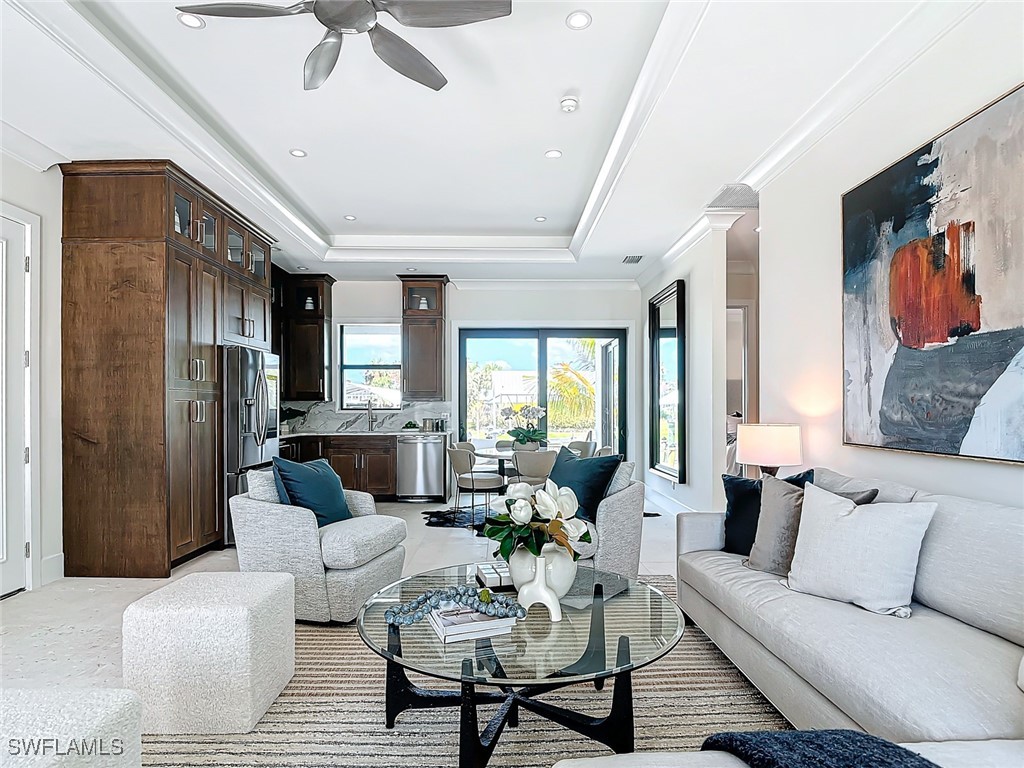 This one of a kind property features ultimate privacy in this exclusive, gated waterfront community. Brand new premium construction by award winning builder, Windward Construction, on a near triple corner lot with nearly 500 feet of seawall, all of which has extra elevation to keep you high and dry. This exquisite smart home features nearly 7000 square feet under air including a massive garage with rear bay doors for ease of transferring supplies to your boat. A boater's paradise with deep water direct access to the Gulf of Mexico. Station your yacht on the 100 foot floating dock with ramp and store your tender boat on its own lift. Utilize the additional 7,500 lb covered lift for your every day watercraft. A total of 5 bedrooms with designated full bathrooms and 2 half bathrooms, one of which is accessible from the pool area. The in law suite with private entrance is an impressive 2 bed, 2 bath alluring space with its own private patio. A welcoming open floor plan features a great room with a backlit granite wall with built in linear electric fireplace and sublime wood beams on the cathedral ceilings. The remarkable outdoor area includes a summer kitchen with built in gas grill, expansive seating area including gas fireplace area, a heated infinity edge pool with integrated spa and lengthy shallow walkout. The spiral outdoor stairwell takes you to a bonus air conditioned room with a breathtaking view which can be utilized in so many different ways. The elegant shell stone tile flows through the home and beyond the pocket sliders bringing a seamless transition to the expansive outdoor living area. This is a custom built home with the Florida lifestyle very much at the forefront of every aspect of construction and design including a 1000 gallon propane tank that will operate the Generac home generator for weeks! Impact doors and windows and dual electric hurricane and insect screens provide added protection to the lanai area. Located just off McGregor Blvd., minutes from beaches, restaurants, and shopping and only 6 miles from the private airport, Page Field and 16 miles from Fort Myers International. The staging furniture has been removed and the home is ready for quick occupancy.