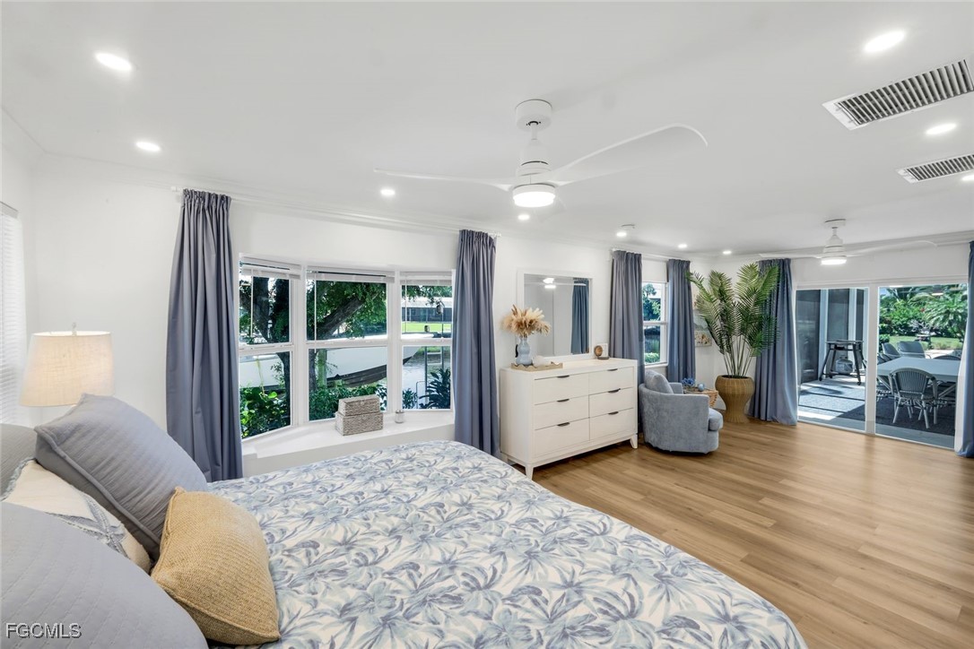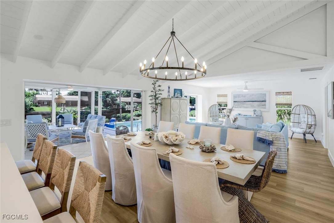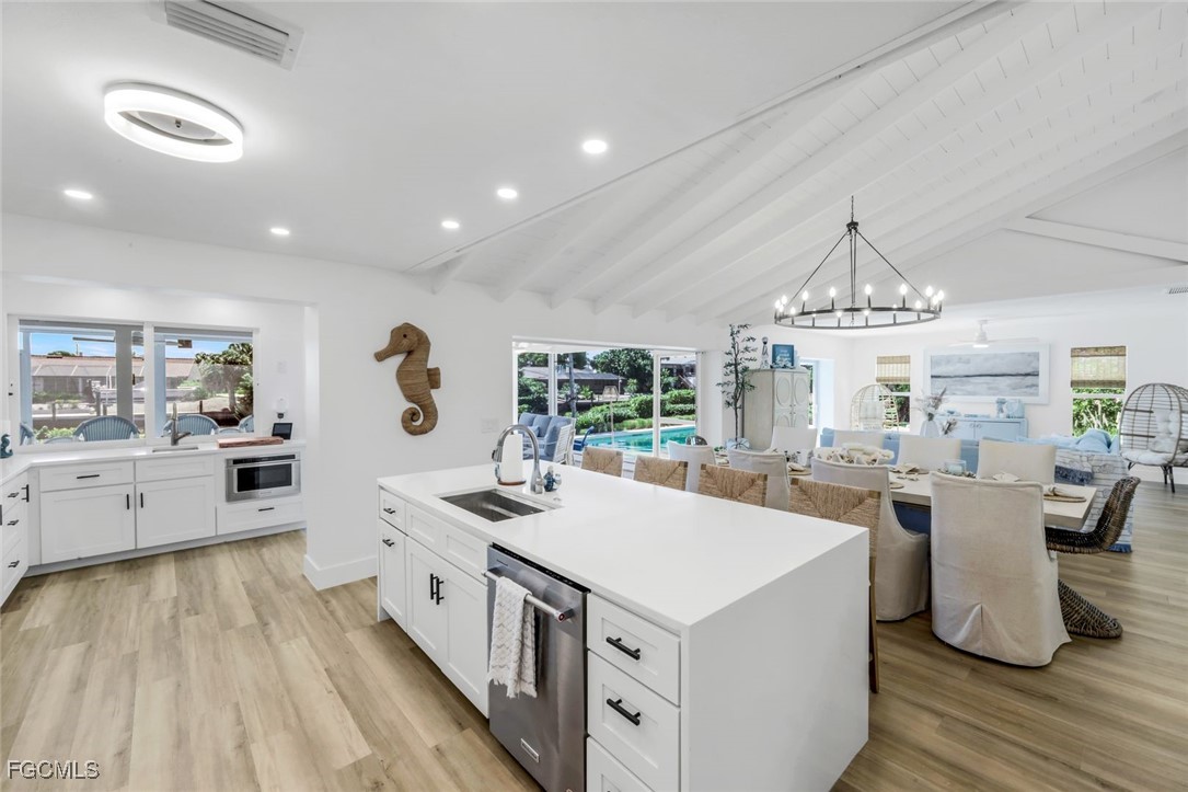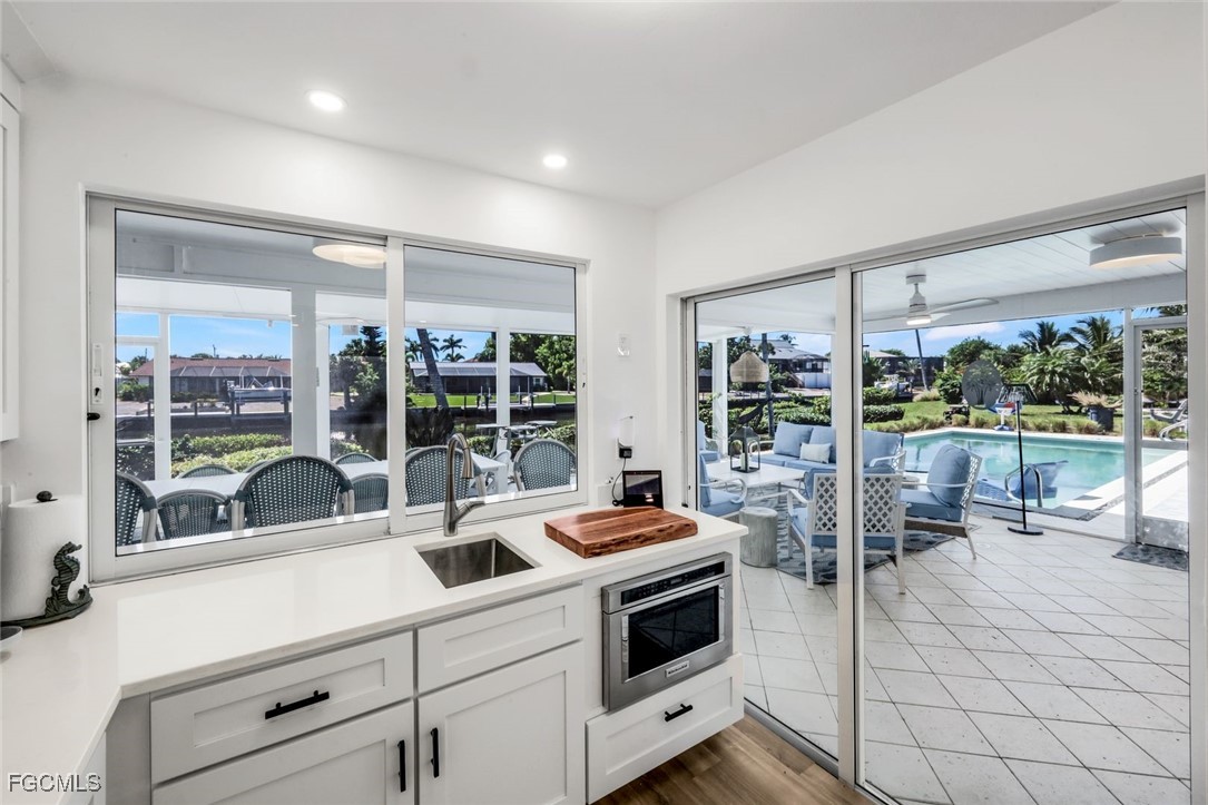 • Open-concept kitchen, dining, and family room with large windows boasting stunning views of the pool, canal, and outdoor living areas