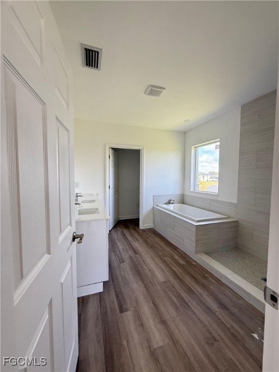 Spacious master suite with: separate soaking tub and walk-in shower, dual vanities, and linen closet