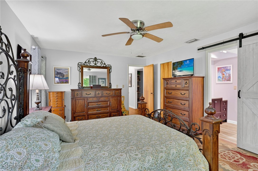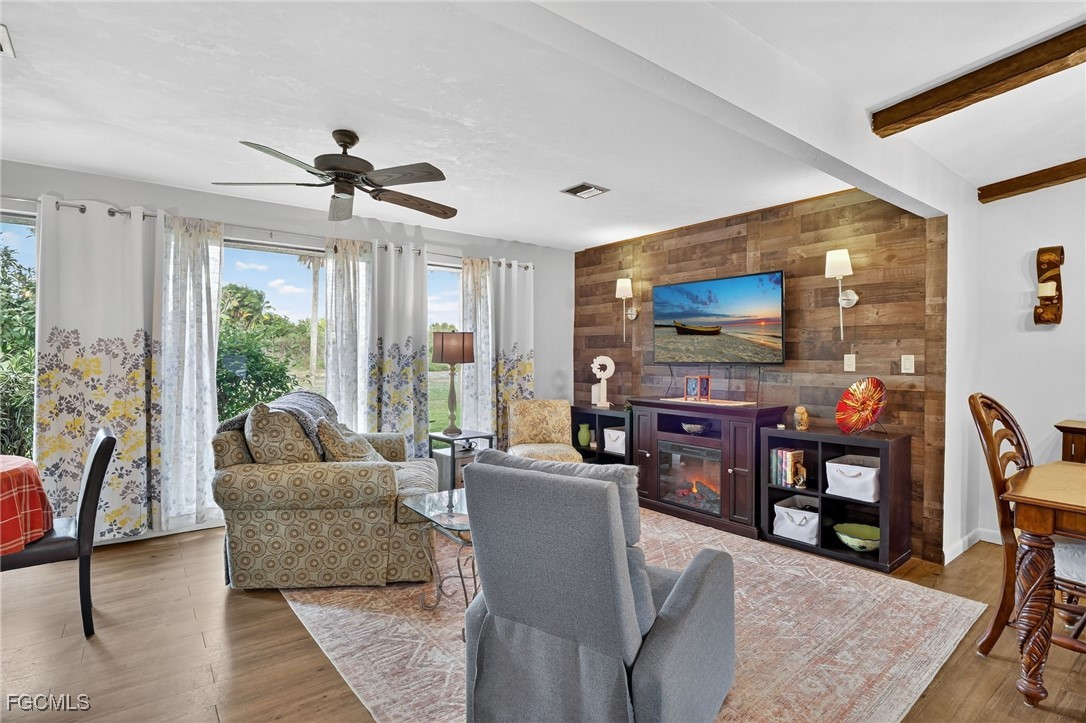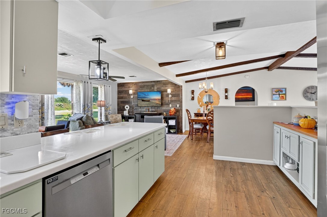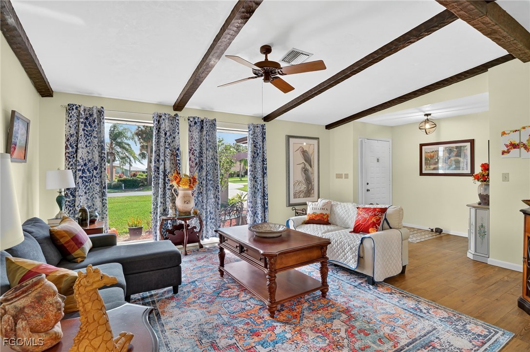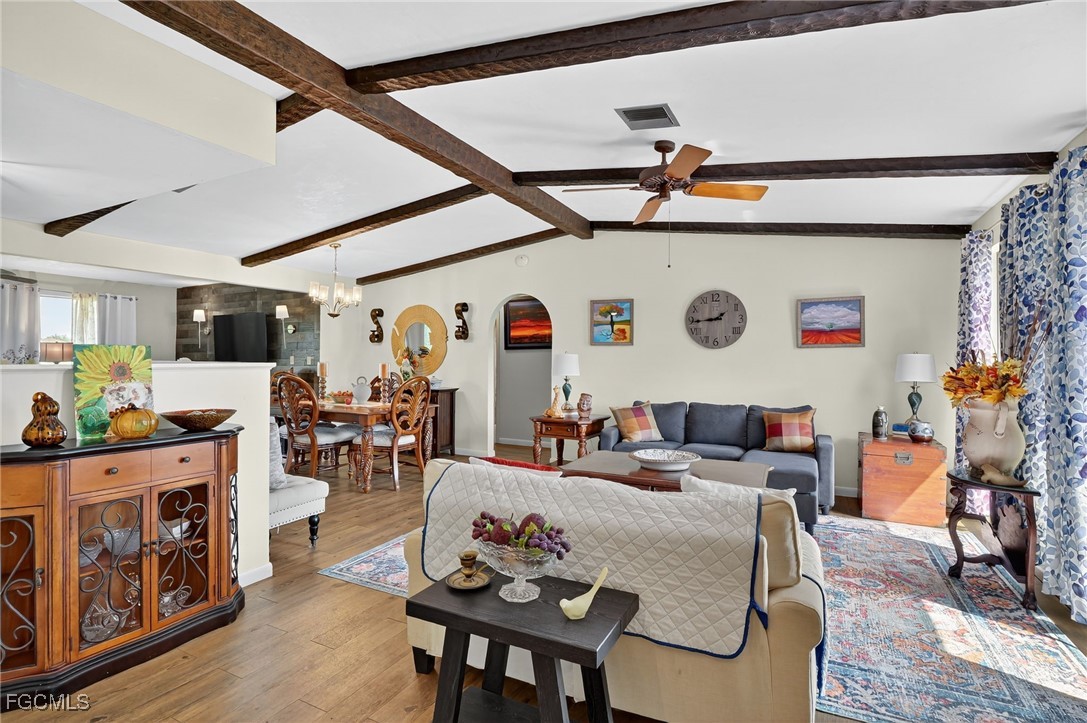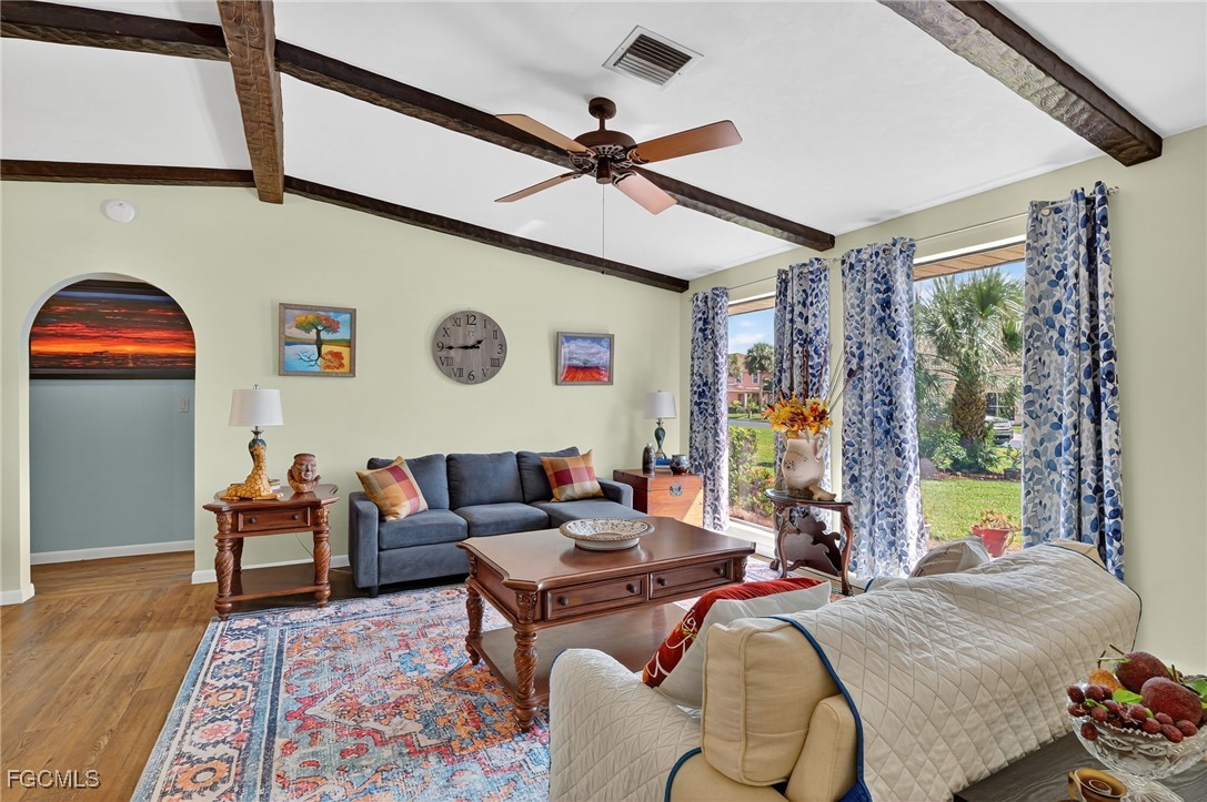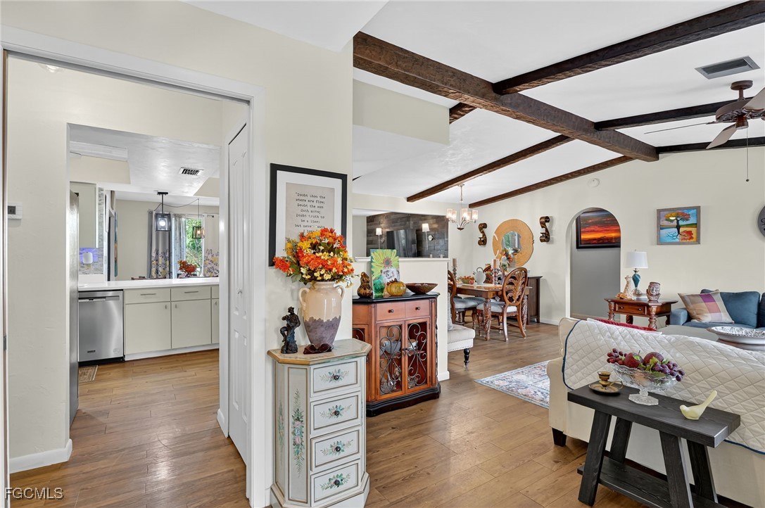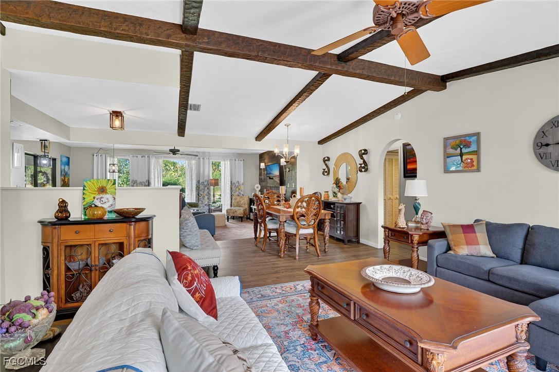 Inside, you'll find a bright and open floor plan featuring cathedral ceilings with exposed wood beams in the Family, Dining, and Living Room areas. The home is finished with light brown vinyl plank flooring throughout, except in the Master Bath and Laundry Room.