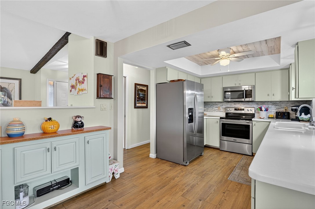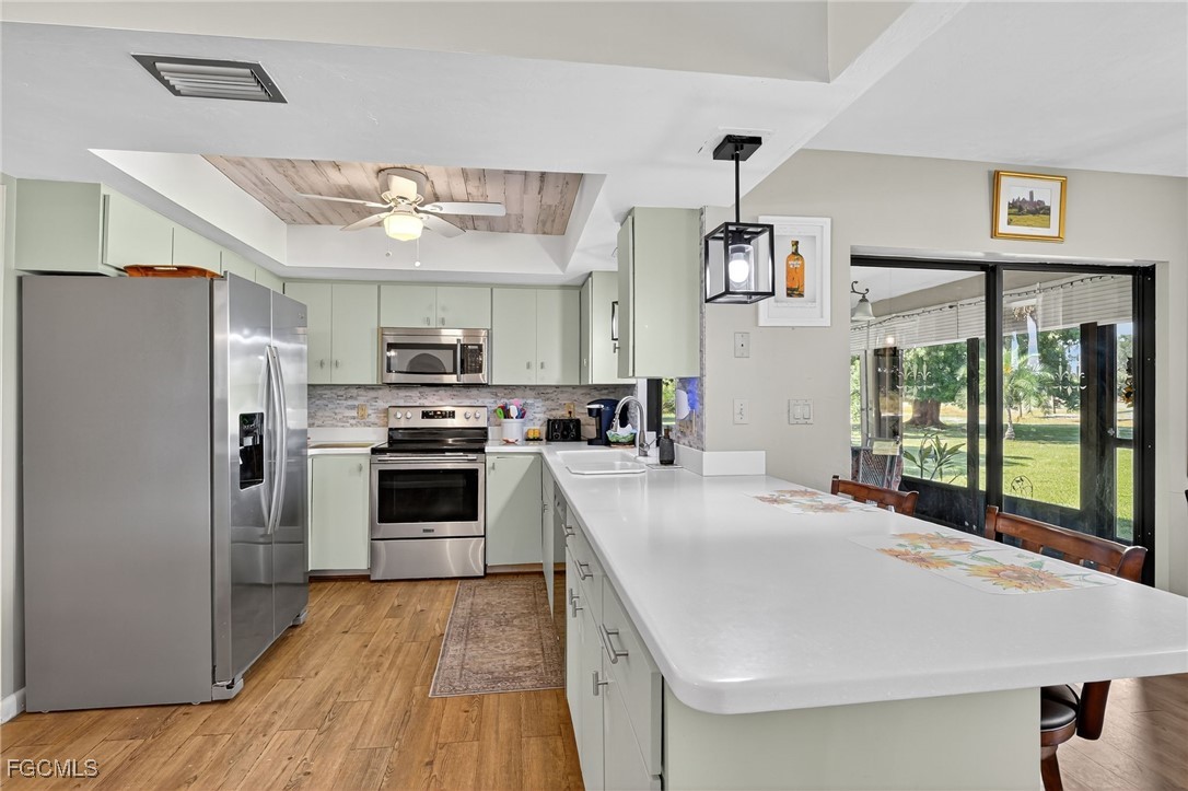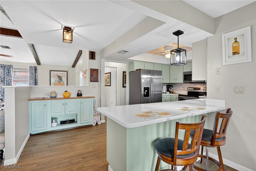 The kitchen is a standout with stainless steel appliances, Corian countertops, a breakfast bar, and a cozy eat-in breakfast nook—perfect for casual meals and entertaining.