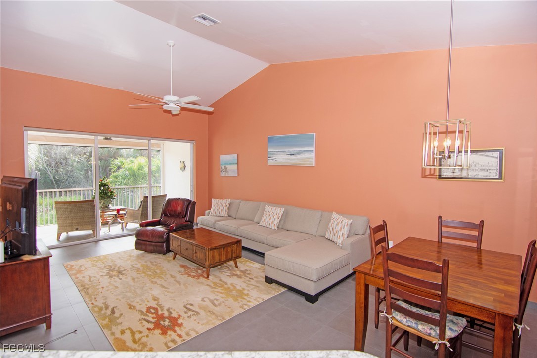 Welcome to your new home in Sunny Southwest Florida! Bring your Pickleball & Tennis racquets and your Swimsuits and be prepared to have a lot of fun in the sun! This mostly furnished second floor condominium in friendly and private Colonial Country Club is a must see! With just over 1,300 square feet of living space, this tastefully furnished and sought after Heather model with soaring vaulted ceilings throughout the main living area lives LARGE! The Home Chef will be delighted by the thoughtfully updated kitchen which is adorned with stylish quartz counter tops with a coordinating tile backsplash, luxury vinyl plank flooring, recessed lighting, a large pantry closet, newer stainless steel appliances and even space for a full sized table and chairs as well as a raised breakfast bar. There is a spacious dining area with a chandelier for more formal dining occasions located directly adjacent to the kitchen. The spacious living room features a triple telescoping sliding glass door that leads directly to the large screened lanai providing an opportunity to relax and enjoy the tropical breezes- all the while overlooking the quiet tranquility of the unique nature preserve here on property. A Storm Smart Screen helps provide storm protection as well as light filtering. The Primary Bedroom has a lovely view of the preserve in the back and an en suite bathroom with dual vanities, an oversized shower and a large walk-in closet. The spacious guest room and updated bath with oversized walk-in shower will make your guests feel pampered and right at home. Featuring great bedroom separation, entertaining is a breeze!