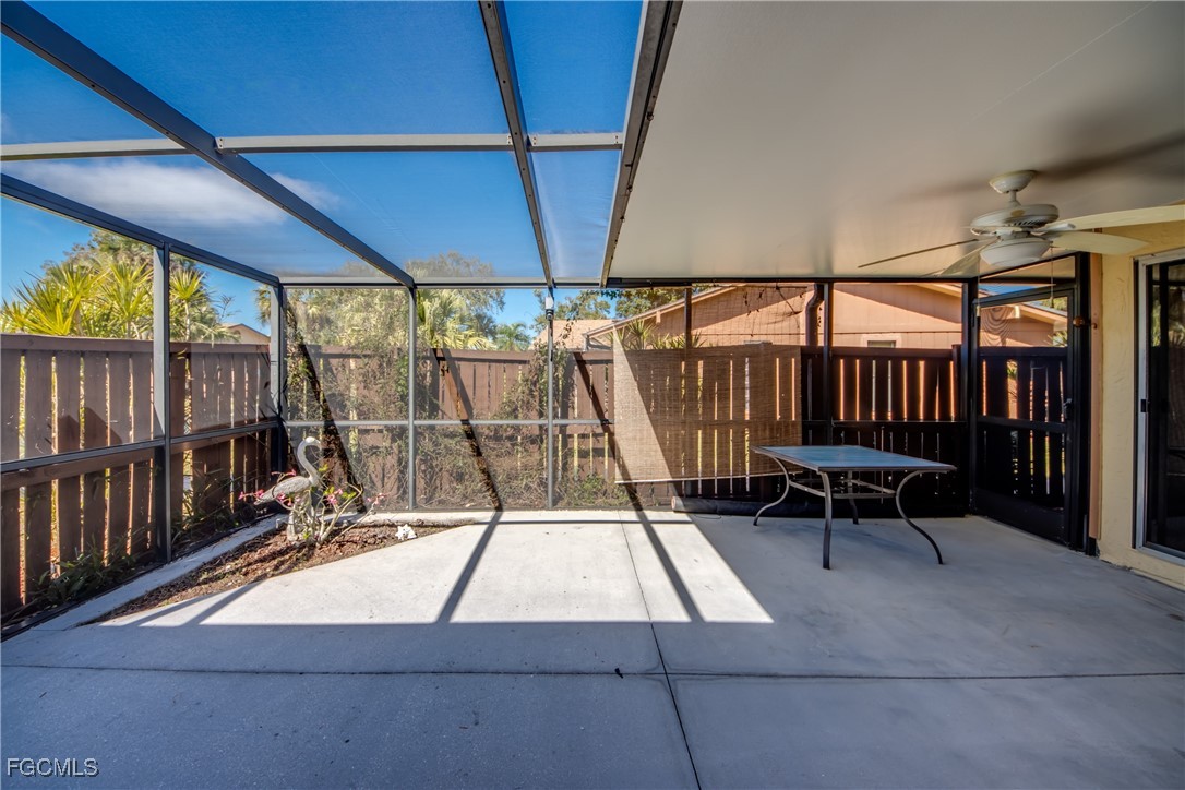 Beautifully remodeled 2-bedroom, 1.5-bath villa located in the heart of Fort Myers, within the desirable Royal Woods community. The home features a private screened-in, roofed front courtyard, perfect for relaxing or entertaining. The updated kitchen features new stainless-steel appliances, beautiful countertops, and modern shaker-style cabinetry. This thoughtfully designed home features two spacious bedrooms, each with sliding glass doors that open to a private courtyard—perfect for enjoying indoor-outdoor living. The primary suite includes a spacious walk-in closet, offering comfort and ample storage. Fresh finishes throughout the home create a light, bright, and airy living space.