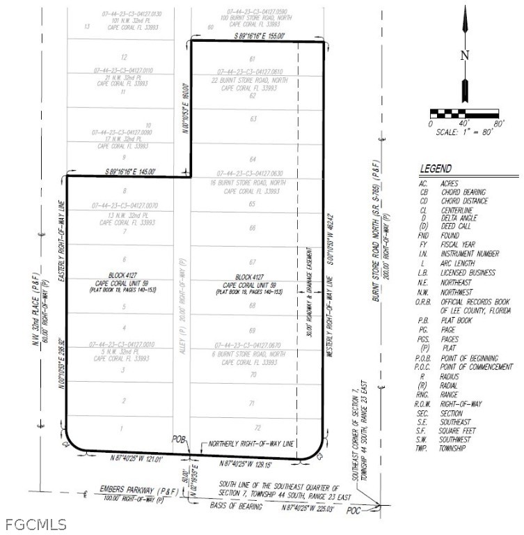 **CITY-OWNED PROPERTY** This property is required to be listed for a minimum of thirty (30) days prior to bringing a contract before City Council for approval. Positioned at the highly visible northwest corner of Burnt Store Road and Embers Parkway, this exceptional vacant commercial site offers a rare development opportunity within one of Cape Coral’s rapidly growing corridors. With additional frontage along NW 32nd Place, the property provides multiple points of access, prominent corner exposure, strong traffic visibility, and substantial frontage along three roadways. Located approximately one mile east of the future 7 Islands development and serving as a southern gateway to the area, the site is well suited for a variety of commercial uses, subject to restrictions, zoning and approvals. The offering consists of approximately 2.8± acres of vacant commercial land, including a platted alley within the site that has been successfully vacated by the City, allowing for a more efficient and cohesive development footprint, as reflected in the boundary survey. This strategically located property represents an outstanding opportunity for developers or investors seeking a high-profile commercial site in a rapidly expanding market. This property is subject to the City of Cape Coral’s North 3 Utilities Extension Project (UEP). All interested parties should independently verify assessments, costs, and implementation timelines with the City prior to submitting an offer. See supplemental attachments in MLS for Restrictions.