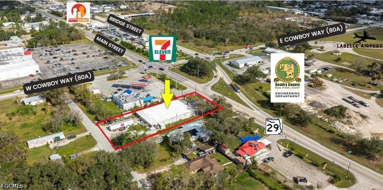 PRIME LOCATION IN BETWEEN WINN-DIXIE AND HELMS ROAD EXTENSION IN PATH OF PROGRESS! The facility consists of a 7,500 sq. ft. steel building with a 1,050 sq. ft. addition. The building boasts a new metal roof (installed in 2023) and new acrylic finished flooring. The property site is .578 acre with 100' on State Road 29 S. Front of the building features asphalt parking area and open canopied front porch for display purposes; back of building is situated on Luckey Street, providing rear access plus the current workshop and repair area including Ted's shed. Zoning is C-2, offering many commercial uses. Property is in Hendry County, but is serviced by City water. The building is open with center offices which can be easily removed or relocated and has some loft storage.