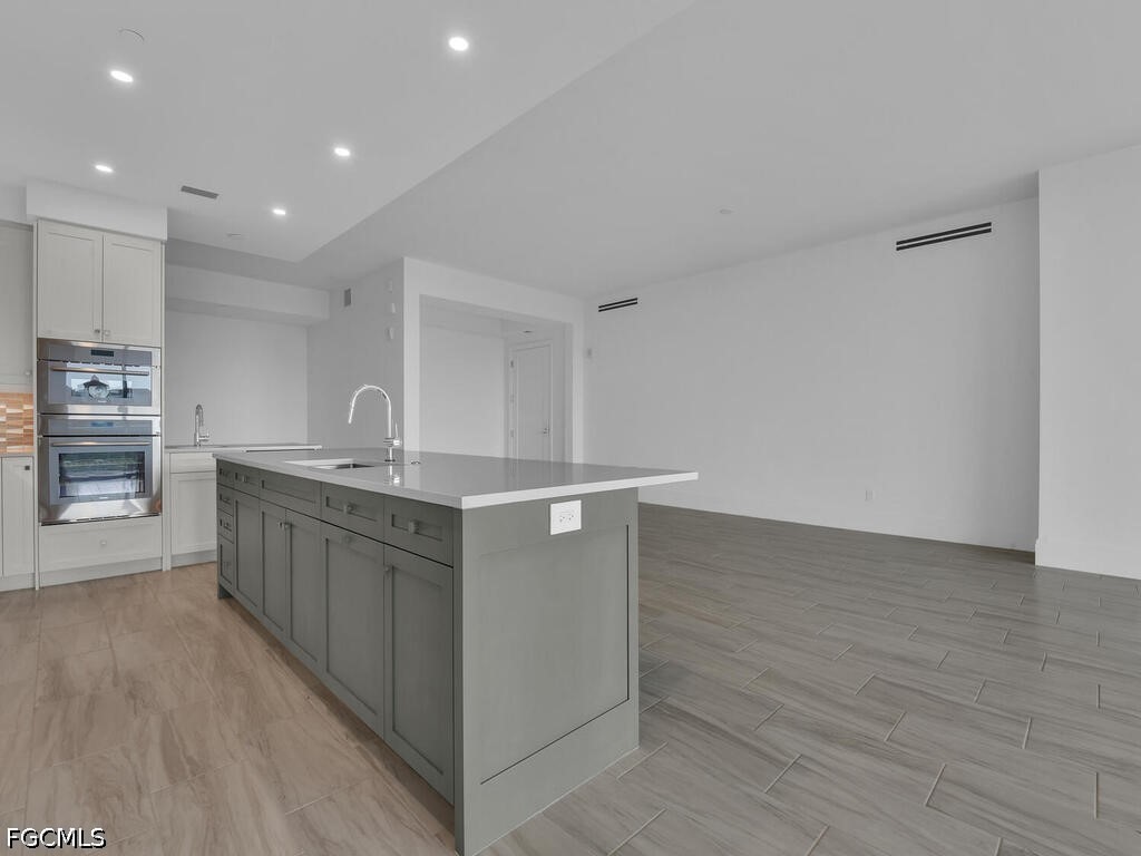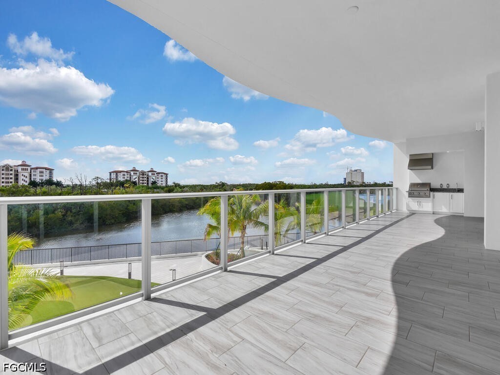 Inside, the residence is bright and open, designed for comfortable living. Floor-to-ceiling glass frames peaceful water views, while a private elevator entry leads into a clean, open layout with high ceilings and seamless indoor-outdoor flow. The kitchen features gas cooking and premium finishes, and it connects naturally to the main living spaces. Sliding glass doors open to a spacious lanai with a built-in grill, creating an easy setting for both everyday living and entertaining.