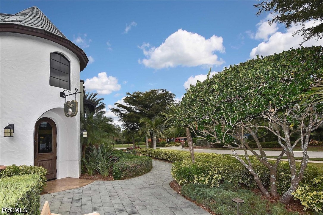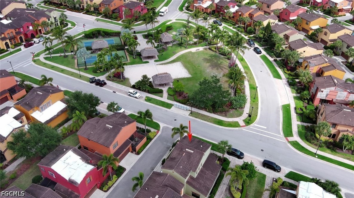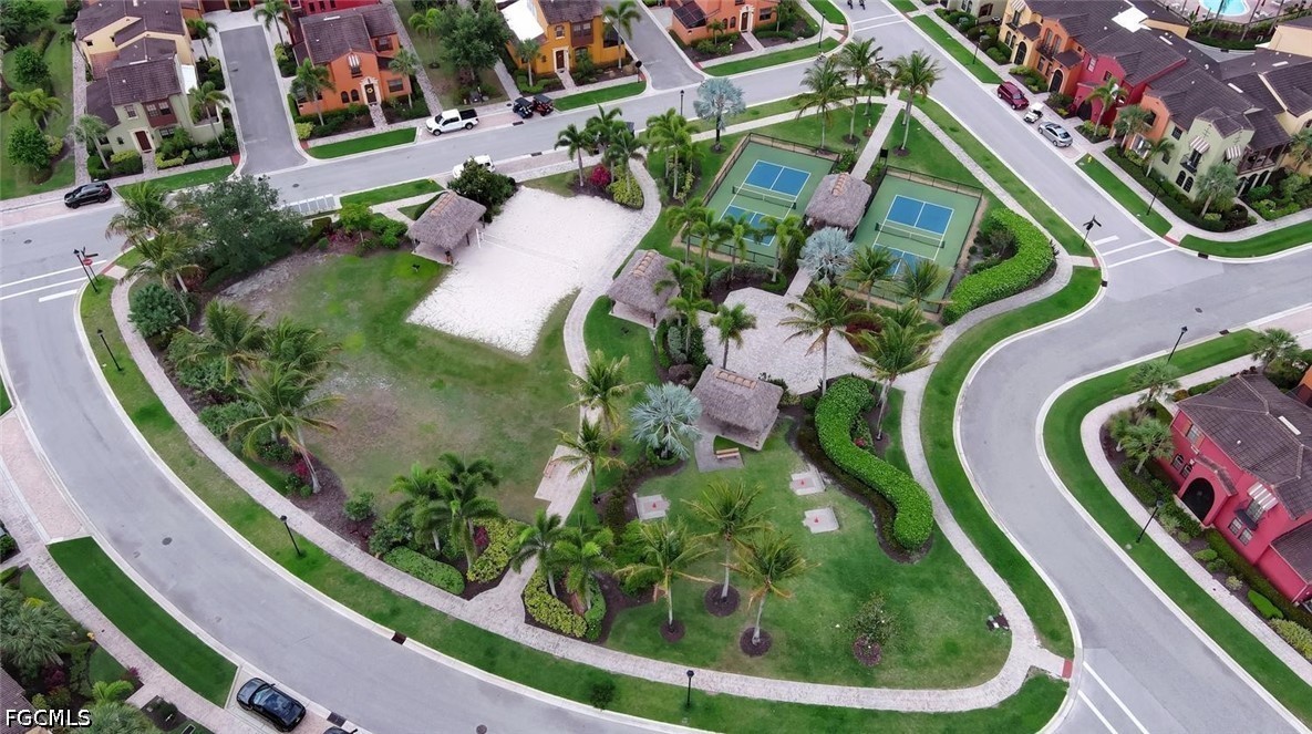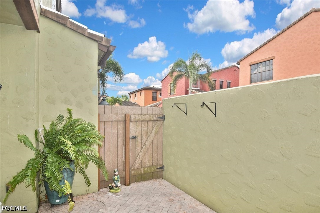 One of the best locations within PASEO! Directly across from Lifestyle Park's pickleball courts, sand volleyball court, BBQ grills with shaded chickee huts and picnic tables (even the mailbox station!), a slice of Paseo's famous luxury amenities are right at your doorstep. This lovely TURNKEY townhome, the Cordova Casita, is freshly repainted and professionally cleaned, and offers a peaceful and private setting with no noisy upstairs neighbors. Enter into a welcoming tiled living room enhanced by crown molding and a western-facing wall of windows with a door leading onto the private walled & brick-pavered patio, perfect for your flowering plants or potted garden! On the opposite side, you'll find the dining room adjacent to the spacious kitchen with a mobile stainless steel-topped island on wheels, which beautifully accents the GE stainless appliance package (with a brand-new dishwasher installed April 2026!) and the easy-to-clean checkered metal backsplash. Rich 42" pecan-colored cabinets with crown molding complement the granite countertops and provide ample room for all of your dishware, pots & pans, spices and more, in addition to a big walk-in pantry with customized shelving. A generous south-facing double window by the kitchen desk affords plenty of light as you work. A convenient half-bath with pedestal sink and brushed-nickel fixtures serves the ground floor. The lush dark wood of the staircase, with motorized chairlift, carries throughout the second floor's two ensuite bedrooms, both with custom closet-system shelving & drawers, and separated by a granite-topped hallway work station and the washer/dryer closet. Three stairway windows provide generous light onto the work station area! The home's two-car garage with coded keypad and epoxied flooring has a large storage closet with generous shelving, as well as an alcove area for even more storage. PASEO remains one of the most picturesque and highly-desired communities in all of Lee County. Picture YOURSELF living here!