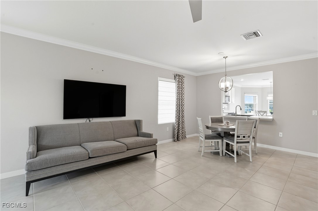 Inside, the open-concept floor plan is designed with both comfort and functionality in mind. The spacious living room flows seamlessly into the dining area and kitchen, creating the perfect setting for entertaining guests or enjoying family time. Large windows and sliding glass doors allow abundant natural light to fill the home while providing easy access to the screened lanai. The kitchen is equipped with modern cabinetry, ample counter space, and a convenient breakfast bar for casual dining.