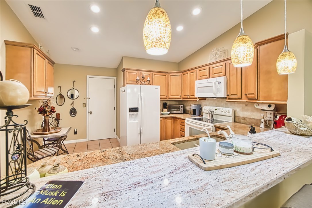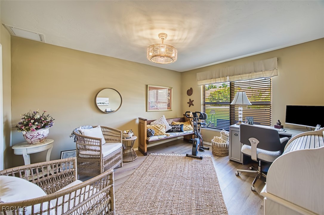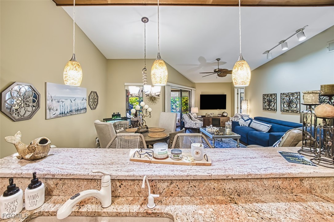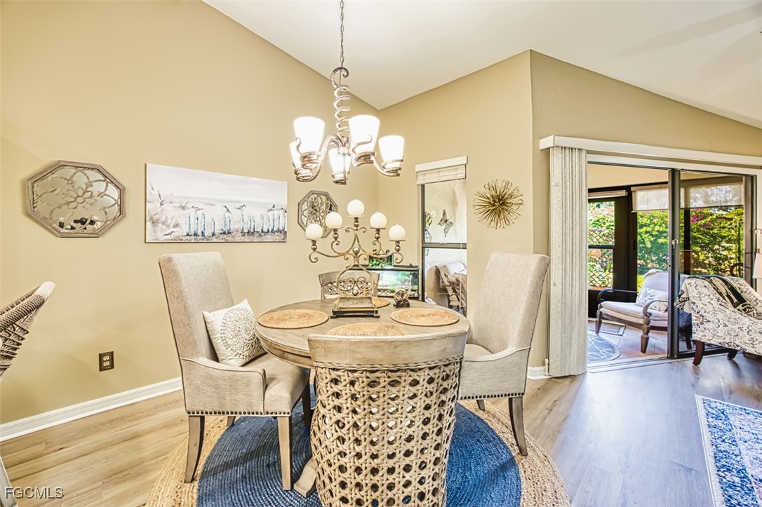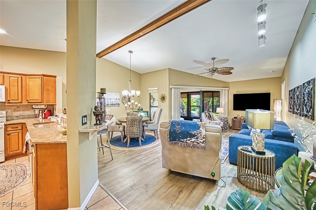 Discover this beautifully updated 2BR/2BA villa in the gated community of Governors Island—just a few steps from the community pool! This rare floor plan features two ensuite bedrooms, perfect for hosting guests or accommodating multigenerational living. Enjoy soaring vaulted ceilings with exposed beams, a granite kitchen with rich wood cabinetry, and durable LVT and tile flooring throughout. The enclosed, air-conditioned lanai provides ideal flex space for a home office, den, or hobby area. Relax or entertain outdoors with a private gated courtyard in the front and a secluded backyard patio—perfect for grilling and al fresco dining.