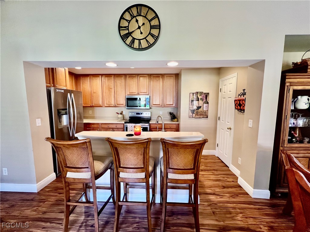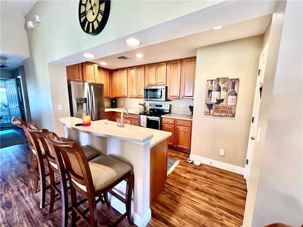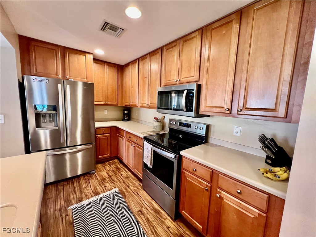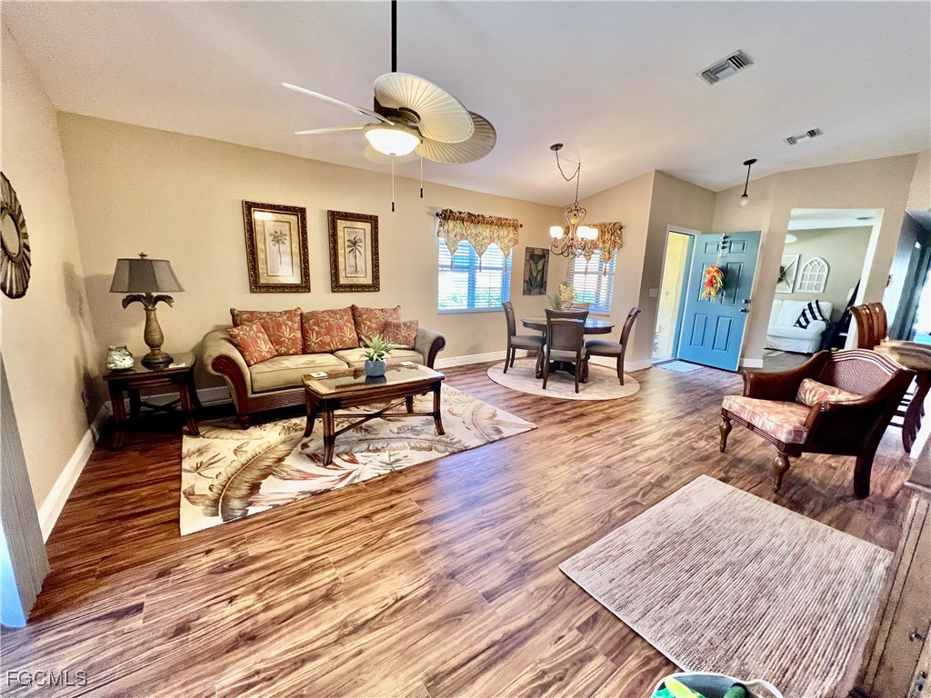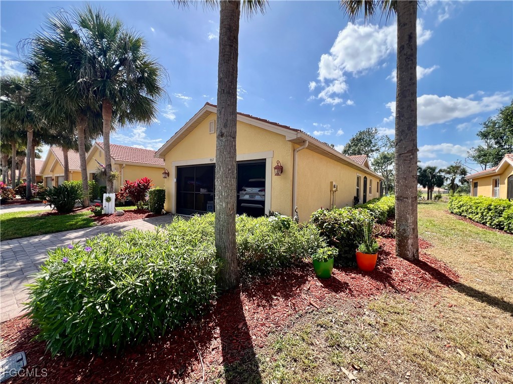 Popular Vistanna Villa 2 bedroom 2 bath with den that may be used as a THIRD BEDROOM, EXTENDED LANAI IN THE REAR 12 x 19 overlooking the golf course with plenty of privacy, common resort style pool plus a playground area, gated entry, excellent location just minutes to SR 82, I-75 and Ft Myers, newer luxury vinyl plank floors throughout, solid surface countertops in the kitchen with breakfast bar, pantry and stainless steel appliances including a French door refrigerator and brand new built in microwave, CENTRAL HEAT AND AIR NEW IN 2017 AND NEW WATER HEATER NEW IN 2017, primary bedroom in the rear with plenty of natural light, large walk in closet, ensuite primary bath with dual sinks with newer faucets, new commodes and tiled walk in shower, newer granite top in the guest bathroom with new commode as well, indoor laundry area with full size washer and dryer, plenty of room in the screened double garage with pull down stairs for storage and laundry tub, screened front entry door as well, screened from the front to the rear for excellent cross ventilation on those nice days. NO AGE RESTRICTIONS. Pets OK. NO FLOOD INSURANCE REQUIRED. LEHIGH IS THE HIGHEST ELEVATION IN LEE COUNTY.