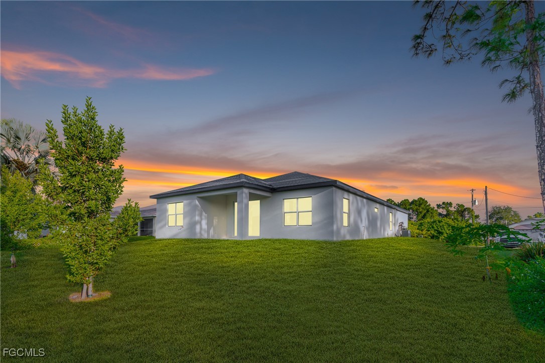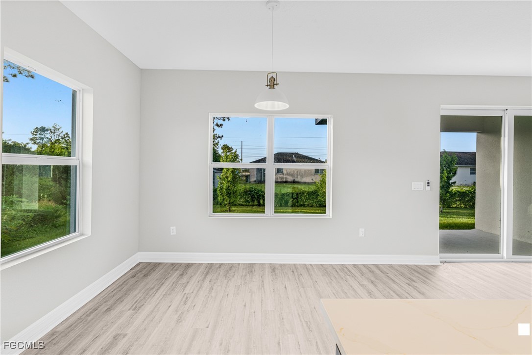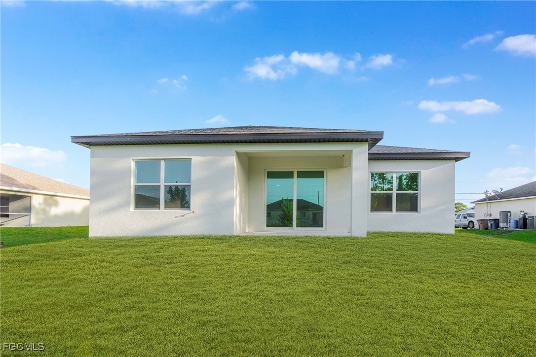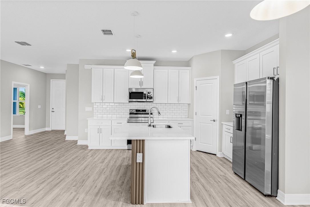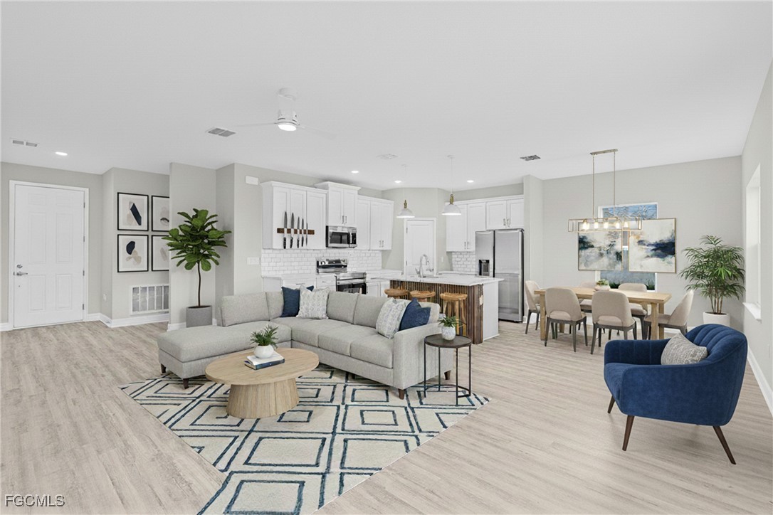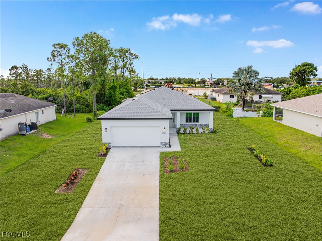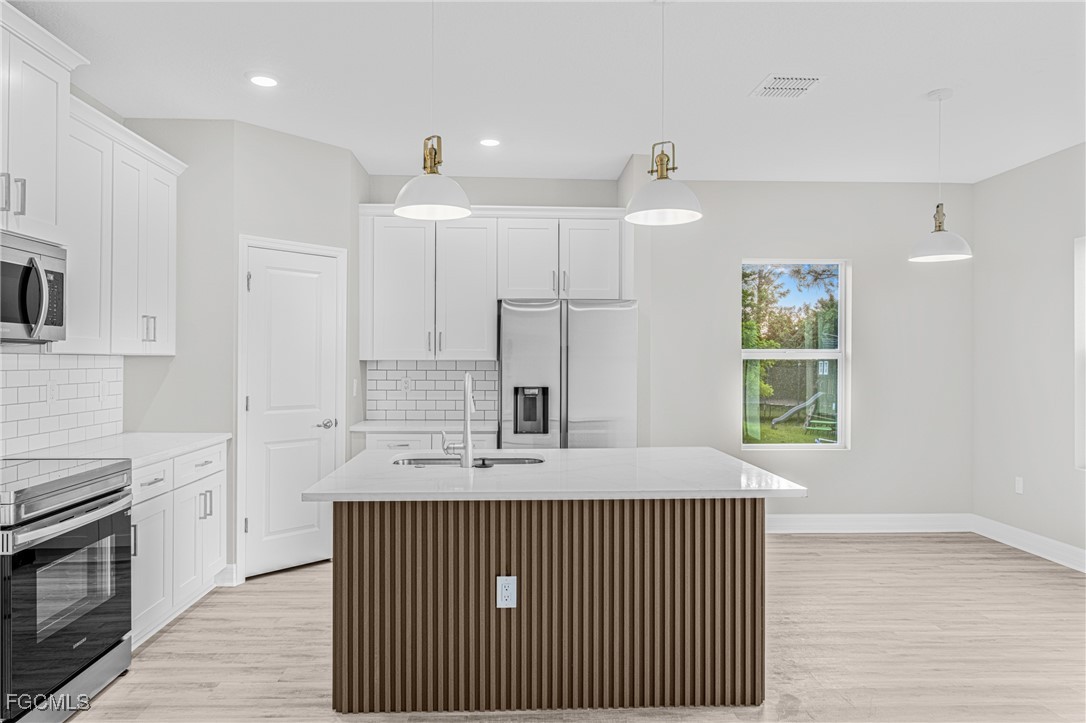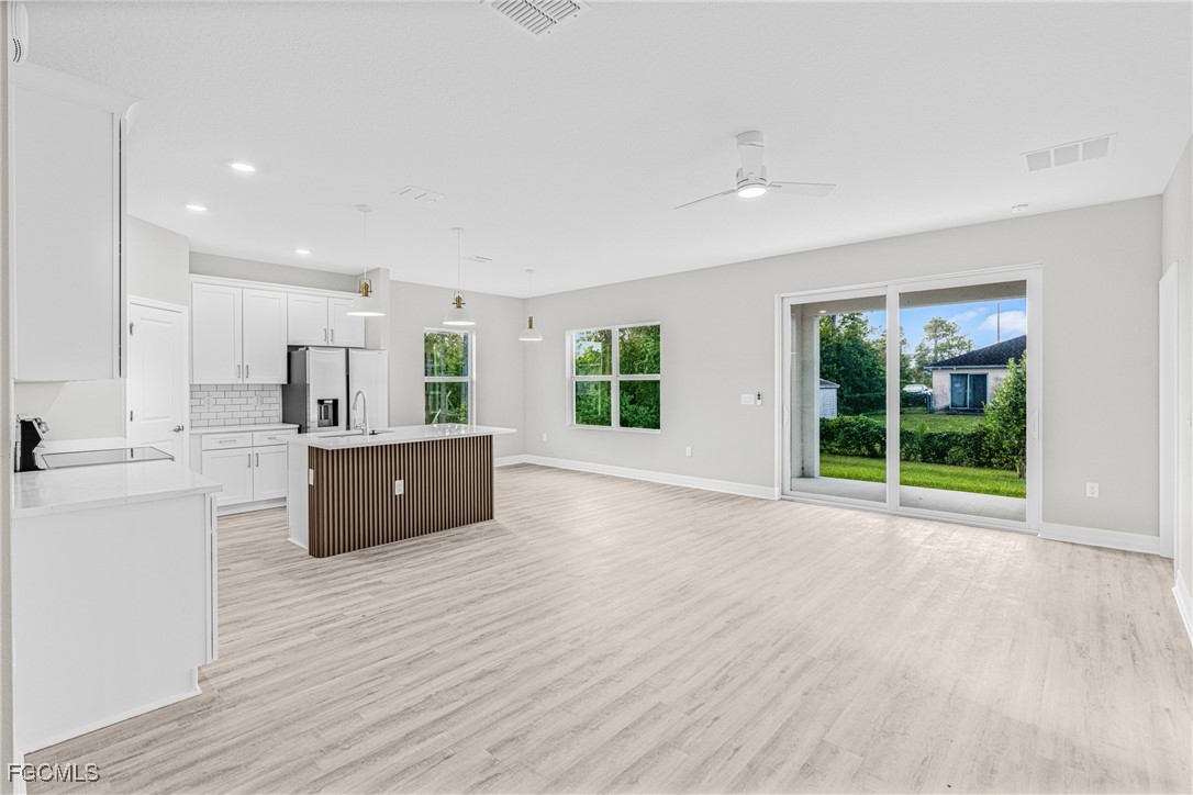 Step into modern Florida living with this brand-new 3-bedroom, 2-bath home spanning 1,615 sq. ft. of pure style and comfort — ready for immediate move-in! From the moment you walk in, you’ll notice the attention to detail. Reef Gold luxury vinyl plank flooring throughout (no carpet anywhere!), dramatic high ceilings, and premium finishes that make every space feel elevated. The chef’s kitchen steals the show with Samsung stainless steel appliances, a large quartz island, subway tile backsplash, and plenty of cabinet space — perfect for hosting, cooking, and creating memories. The primary suite offers a relaxing retreat with a frameless glass shower and modern Moen fixtures. Outside, you’ll find a paved driveway, automatic irrigation system, and a 0.24-acre private lot with room to grow or add a pool. This home was built for efficiency and peace of mind with double-pane windows, energy-efficient Goodman HVAC, and washer & dryer included.