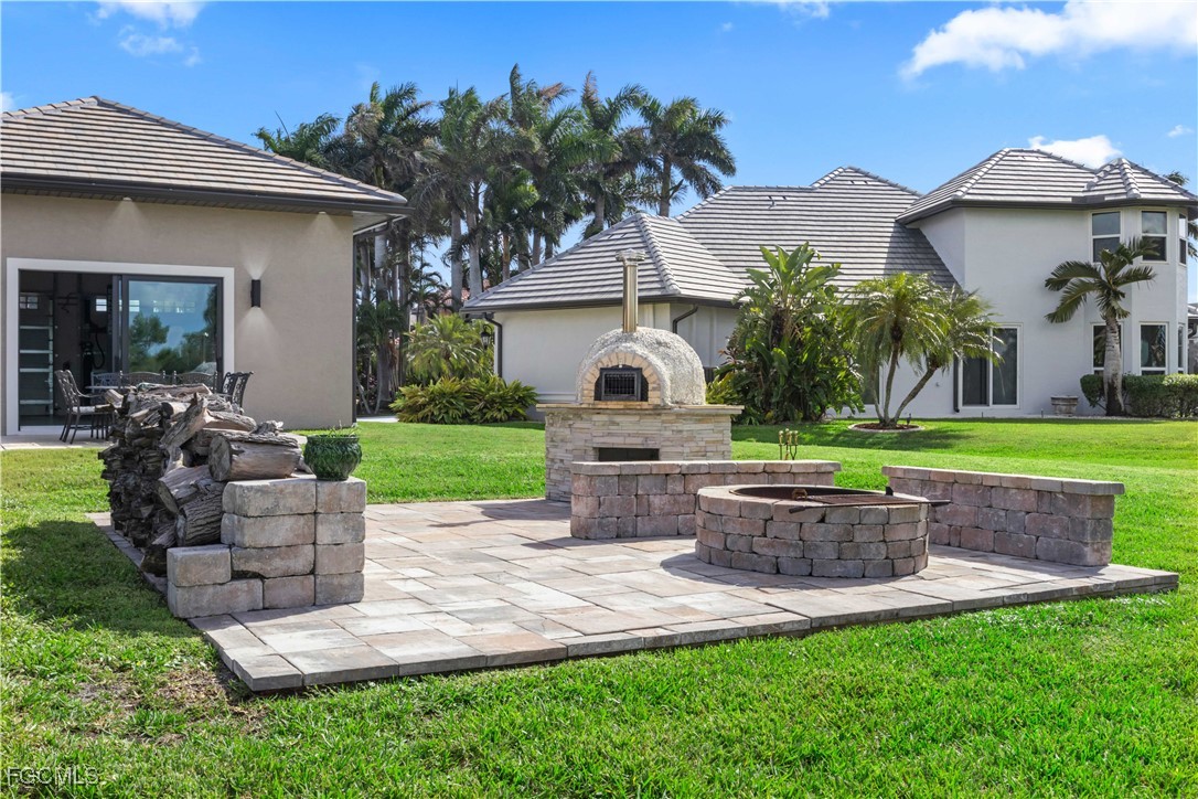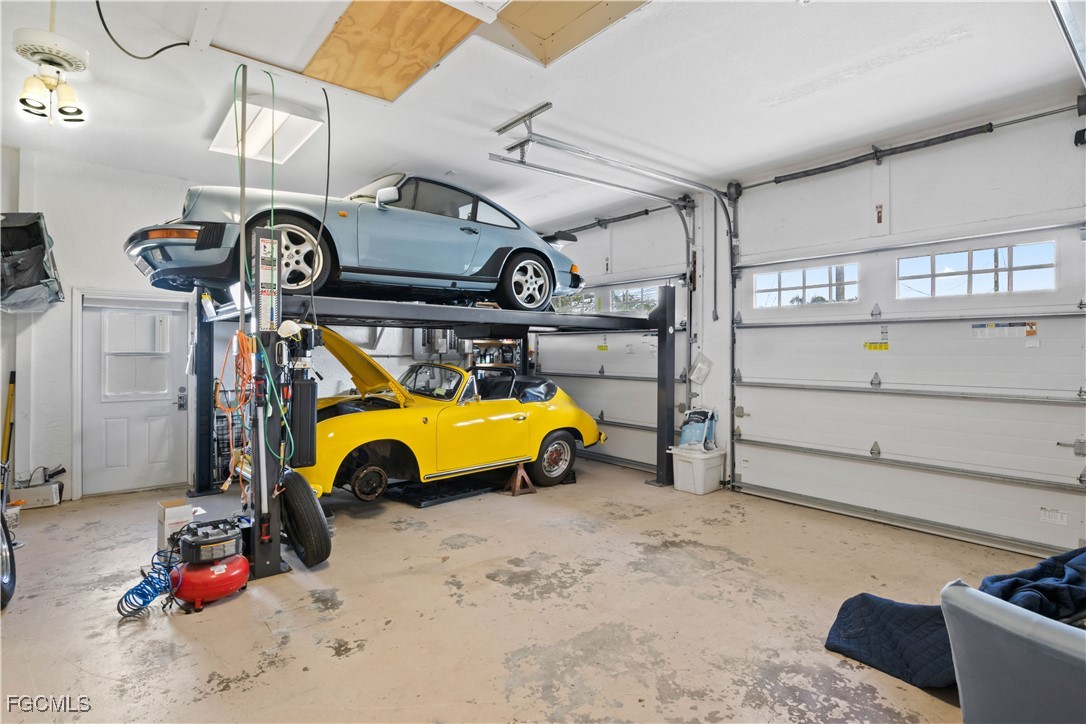 The property also features an oversized, climate-controlled second two-car garage, a true rarity in Cape Coral—complete with PGT impact windows and sliders, epoxy flooring (2023), utility sink, custom cabinetry, and a Ben-Pak car lift, making it ideal for car enthusiasts or hobbyists. Outdoors, the home transforms into a private resort with a travertine patio, outdoor kitchen, fire pit, and pizza oven, all surrounded by lush tropical landscaping. The lanai screen (2025) and French patio doors (2024) create a seamless indoor-outdoor flow, while culture stone columns and an iron entry door (2020) lend timeless curb appeal.