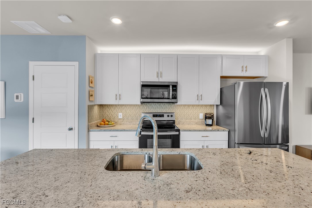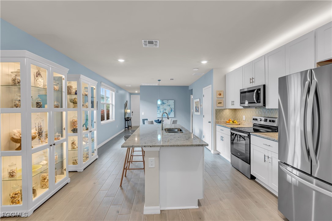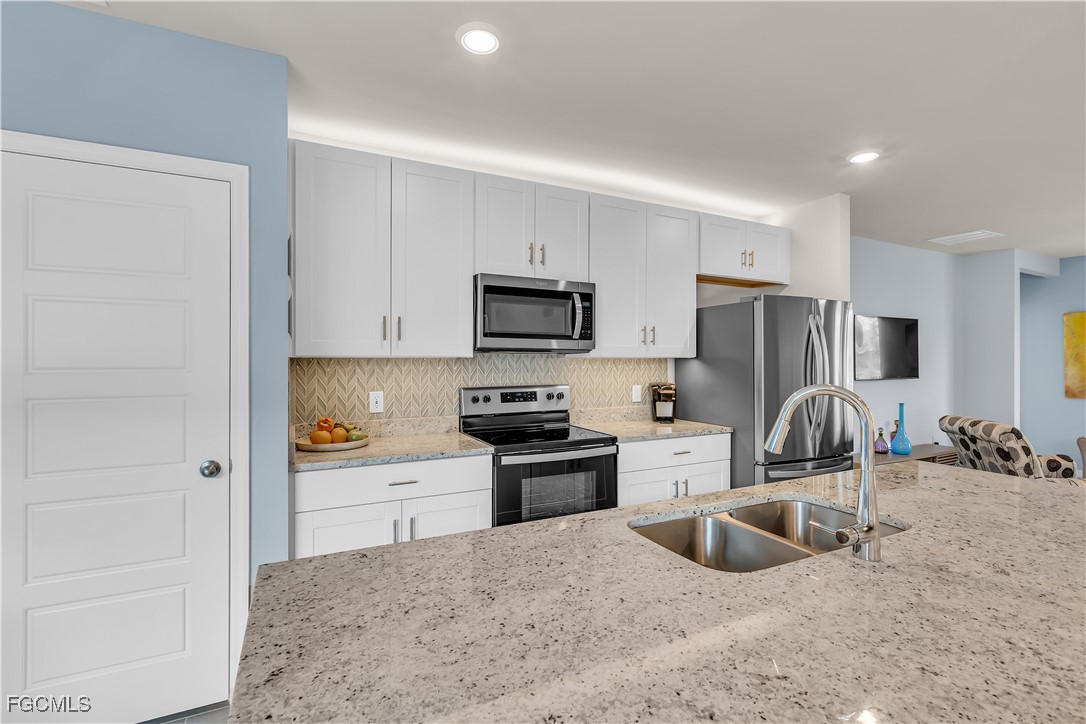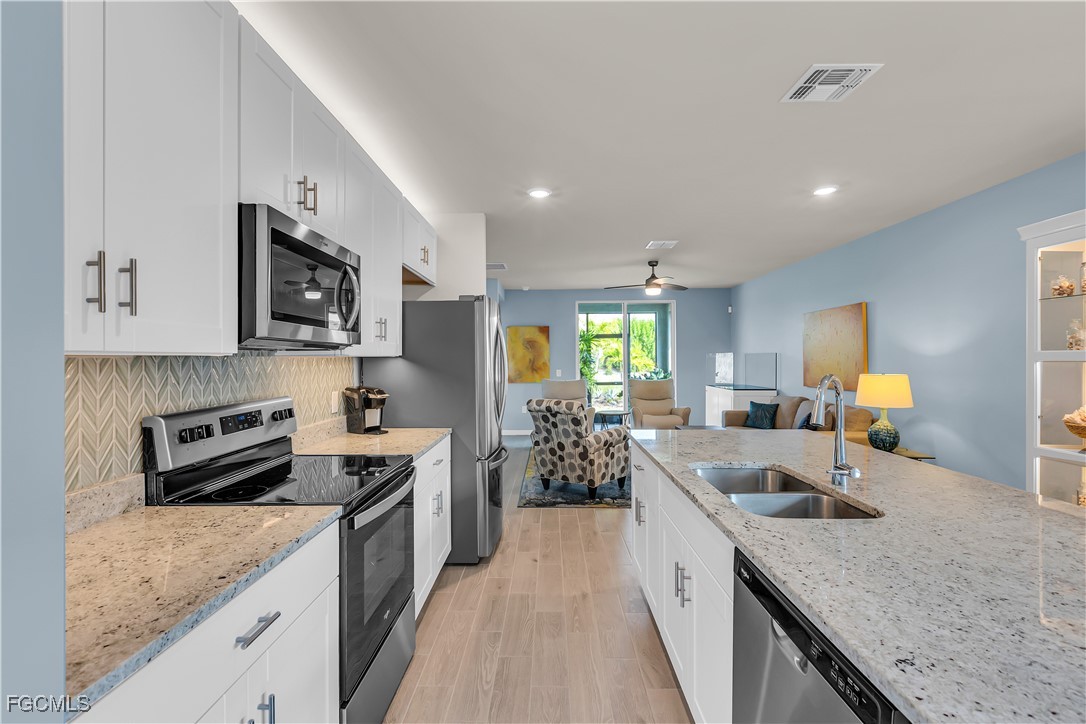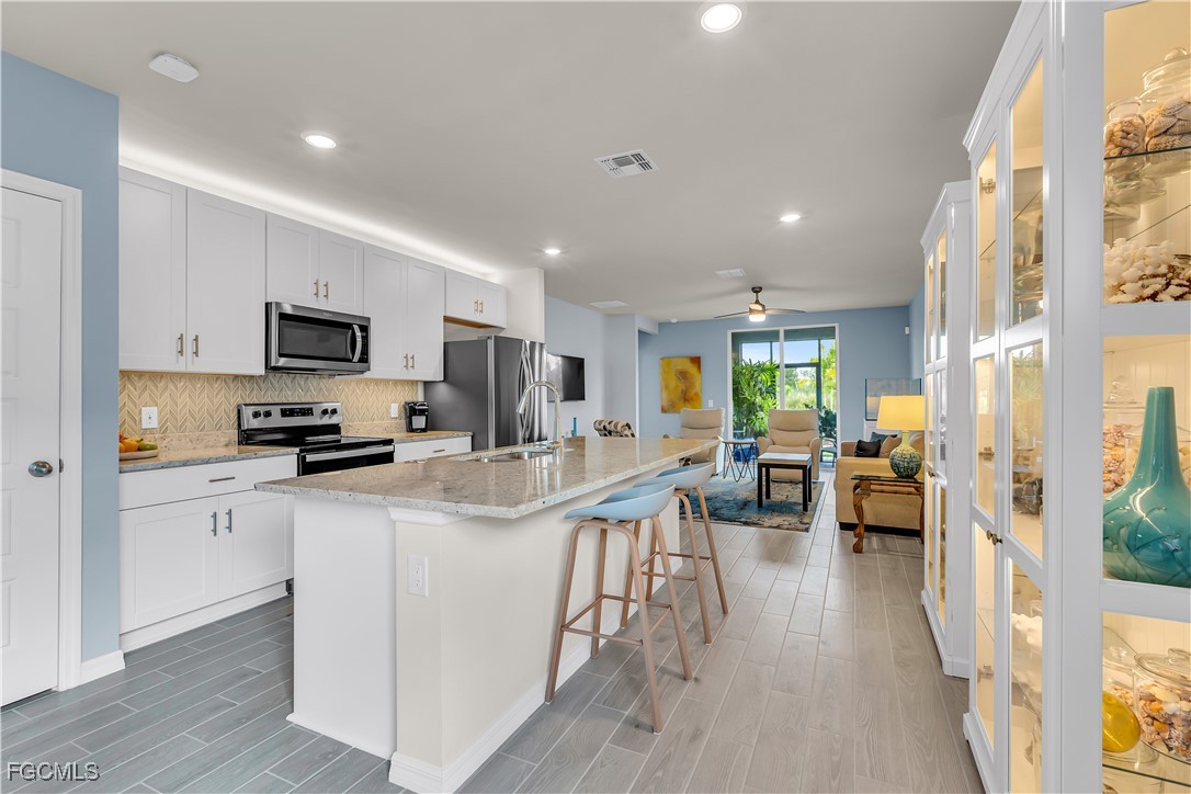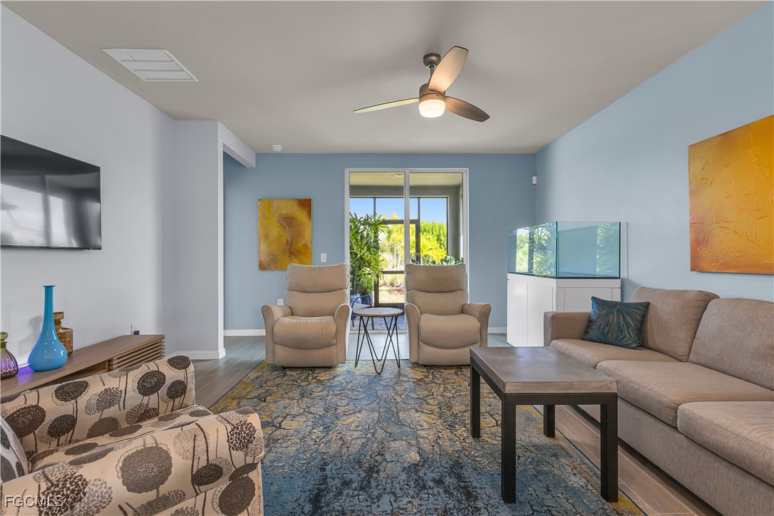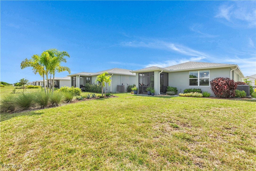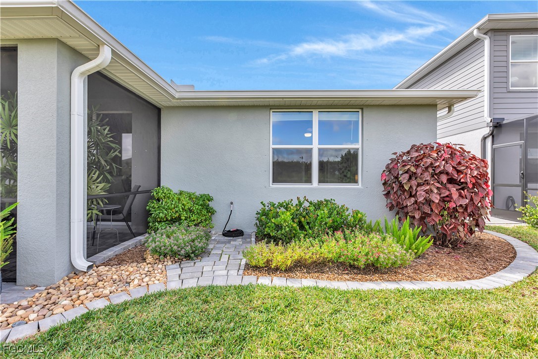 Immaculate Home beautifully landscaped Canary Model 3 bedroom/2 full bathroom. Walk into a warm, cozy kitchen with breakfast bar/ center island. Eat in kitchen with White cabinets upgraded pull out shelves and large pantry. Upgraded Ceramic Tile flooring throughout home. Bedrooms have neutral color carpet. Open floor plan allows Kitchen to flow right into living room. Master bedroom suite perfect for King size bed, Master bathroom has custom built in cabinet for linens and towels. Walk in closet, walk in shower with frameless door and double vanity sinks complete master bathroom. 2 additional bedrooms with full bathroom. Separate Laundry Room and Garage with epoxy garage floor. Shelving units in garage for new buyer. Sellers have completed many upgrades in the home. Gutters, screened lanai, washer and dryer, new refrigerator, window blinds, utility sink in garage, lighting, built in linen closet in master bathroom and exterior coach lights. Please see complete list under docs tab. Internet and garbage collection included in HOA fee.Sellers providing One Year Home Warranty from date of closing. Covers all appliances, AC system and Hot Water tank. Friendly neighbors and sidewalks on both side of the street. Wonderful family and pet friendly communtiy. Clubs for Pickleball and book lovers. Join the fun at the Pool for Wine Down Wednesdays and monthly Birthday Bash celebrating all neighbors with a birthday in that month! Cake and Cookies for all! Welcome Wagon and New Clubs forming. Schedule your showing today to see this beautiful home in a fantastic neighborhood.