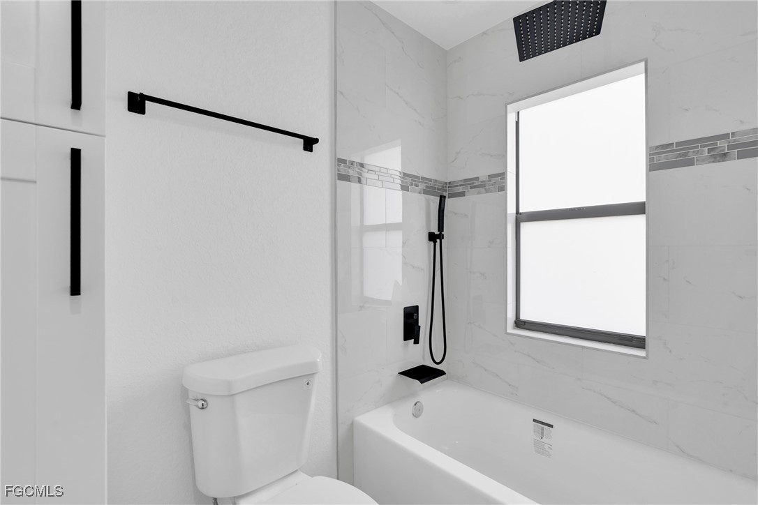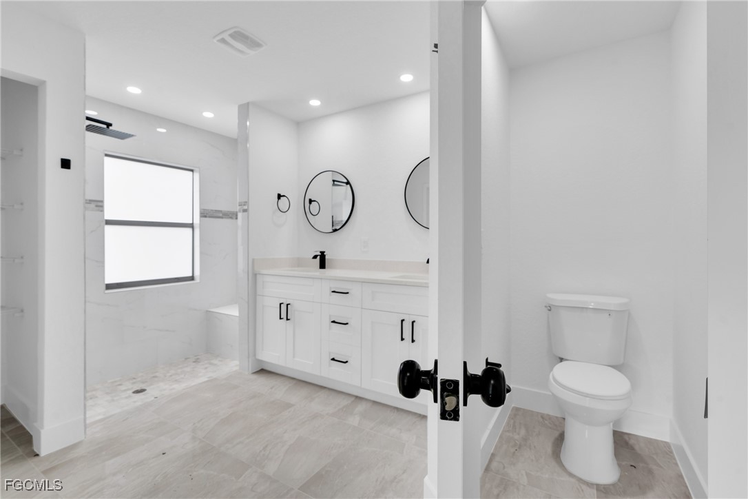 The primary suite offers a serene retreat with a spa-inspired bathroom complete with designer finishes and a custom-tiled shower. Both bathrooms showcase elegant quartz countertops and high-end fixtures, providing a polished and sophisticated look. Impact-resistant windows and doors enhance safety and peace of mind, while the rear covered lanai/patio creates the perfect space for relaxing or hosting guests.