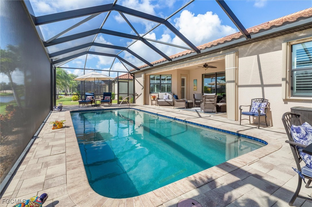 EVERY DAY WILL FEEL LIKE A VACATION IN THIS AMAZING HOME! Experience the best of Florida living in this spacious and impeccably maintained 4-bedroom, 2-bath home with a 3-car garage in the highly desirable, GUARD-GATED community of GRAN PARADISO at WELLEN PARK. Built in 2016 and located in an X FLOOD ZONE (per LOMR), this property offers peace of mind and resort-style amenities in a top-rated school district. The home makes a lasting impression with its tile roof, stacked stone accents, lush enhanced landscaping, and a wide paver driveway that provides parking for family and guests. Backyard oasis features a custom Indigo-designed SALTWATER POOL with CLEARVIEW screening for uninterrupted lake views. The pavered patio and pool deck offer multiple areas for lounging and dining, while the NEBULA STARLIGHT LIGHTING in the lanai ceiling creates a magical evening ambiance. Whole-house gutters with buried drains and a freshly painted exterior (2023). The home has been upgraded to include PLANTATION SHUTTERS, COFFERED and TRAY ceilings, accent wall & decorative trim in the main bedroom, custom ceiling fans, tile flooring in living areas. OPEN FLOORPLAN is filled with natural light and offers beautiful pool/lake views from the main living areas. The spacious FAMILY ROOM is open to the kitchen with granite countertops, custom backsplash, upgraded SS appliances (newer dishwasher & refrigerator). Recent improvements include a NEW AC (2022) with transferable 10-year warranty and additional attic insulation (2023) for energy efficiency and reduced utility bills. Washer & Dryer will be left for Buyer’s convenience. The home features a 3-way split to the 4 bedrooms, one of which is currently used as an OFFICE/DEN. With plenty of storage capacity, this home offers flexible use for year-round or part-time occupancy. Living in Gran Paradiso means enjoying multiple lifestyle amenities within this highly desirable GUARD-GATED RESORT COMMUNITY, located within the master planned community of WELLEN PARK. Amenities include trails, tennis, pickleball, resort-style pool, hot tub, luxury clubhouse with card and billiard rooms, library, fitness center, steam rooms, sauna. HOA fees include LAWN MOWING, access to all amenities and a LIFESTYLE DIRECTOR to plan events and activities for residents. Take your GOLF CART to the clubhouse to meet friends and enjoy the facilities! The community has easy access to I-75, downtown Venice and multiple sandy beaches on the Gulf. Wellen Park includes restaurants, trails, baseball at the CoolToday stadium (Atlanta Braves spring training) and championship golf courses, plus regular events (concerts, farmers market etc) and a vibrant Downtown area. The area features top-rated Sarasota County schools, including Pine View School for the Gifted (ranked #1 High School in Florida). DISCOVER GRAN PARADISO TODAY!