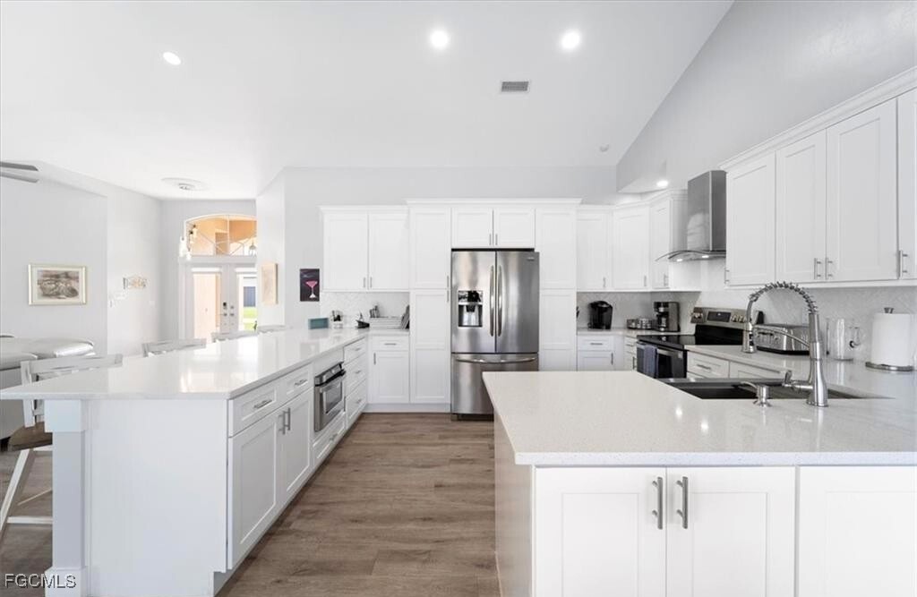 Inside, the open-concept design showcases a beautifully updated kitchen with high-end appliances, quartz counters, and custom cabinetry. Fresh paint, luxury vinyl plank flooring, and refined trim details enhance the home’s elegant coastal style. Expansive pocketing sliding glass doors in the living area open fully to the lanai, creating a seamless flow between indoor and outdoor living spaces.