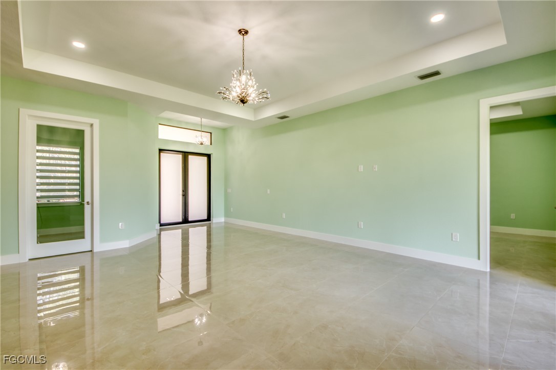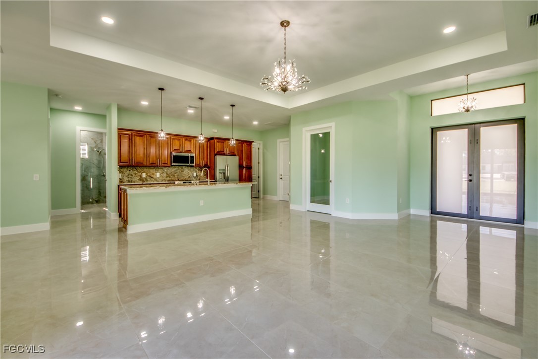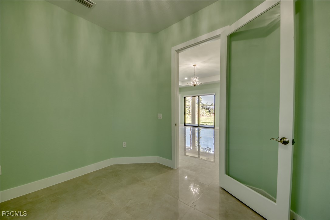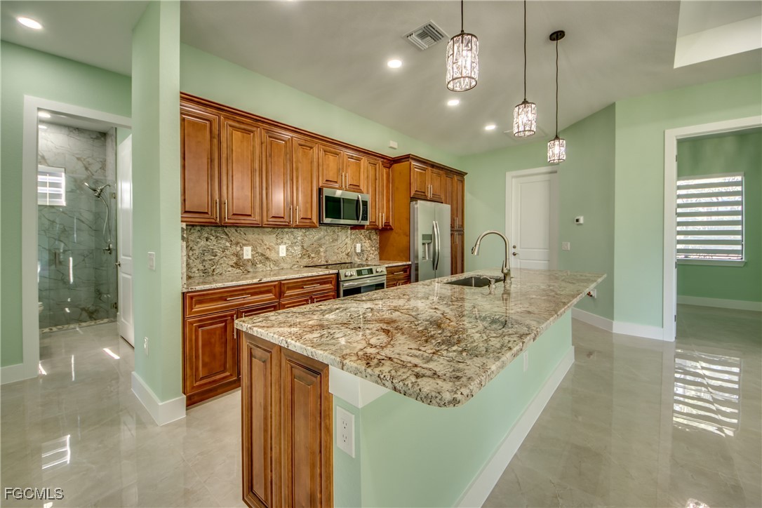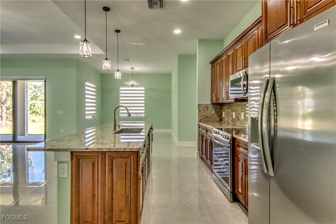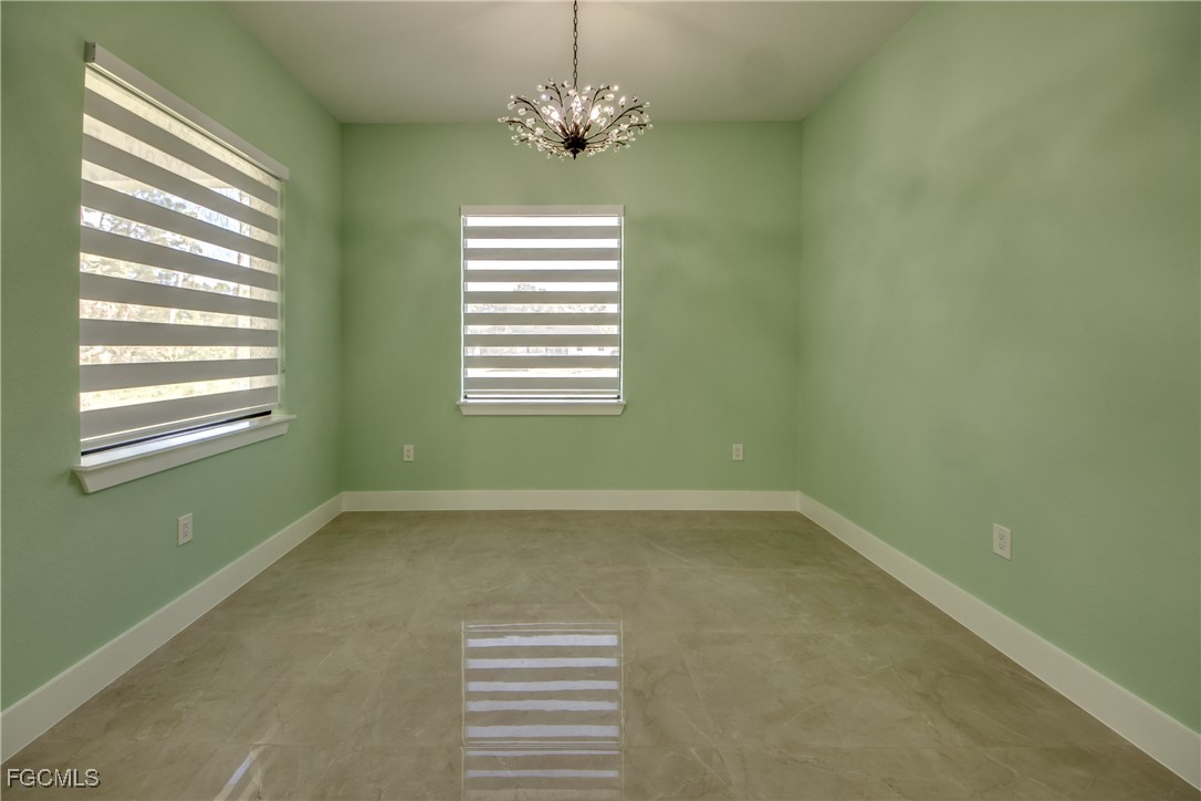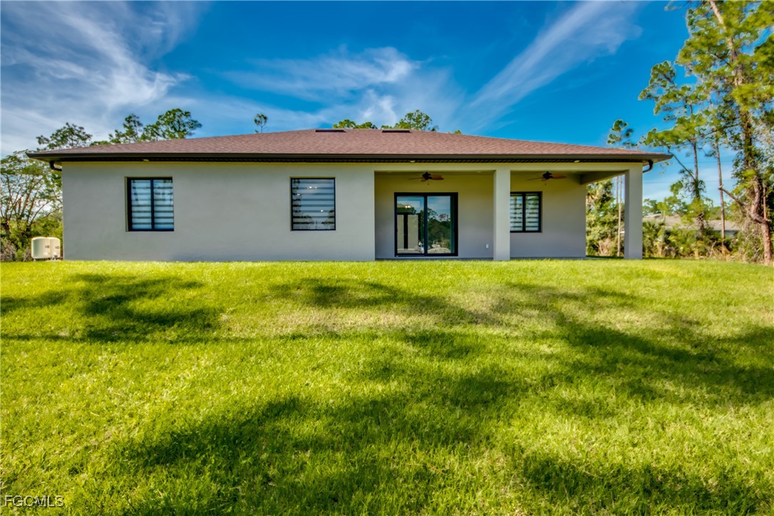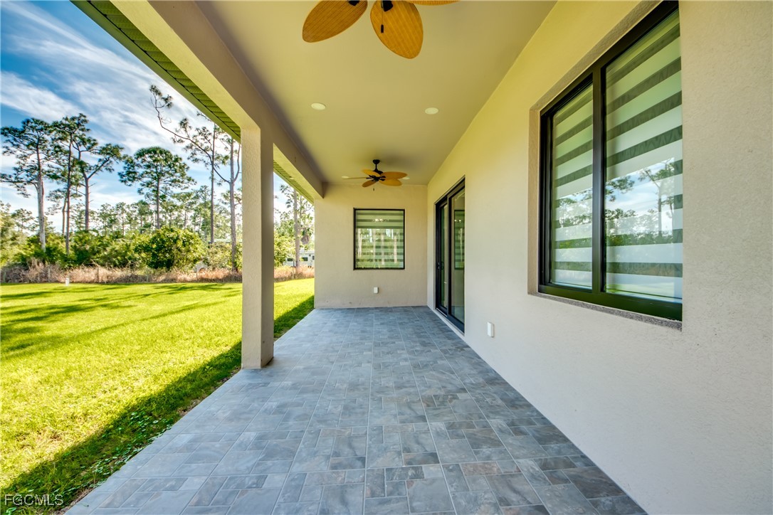 This beautiful new construction boasts over 1900 square feet of living space that offers modern living with an open-concept layout and high end finishes throughout. It offers 3 bedrooms, 2 bathrooms plus a Den, 2 car garage. Situated on a half-acre lot completely cleared and freshly laid with new sod with a sprinkler system. The home's grand entry features a 14-foot ceiling that delivers a striking first impression and 12 foot ceiling throughout the main living area. The heart of the home is a chef-inspired kitchen featuring top-of-the-line appliances (Frigidaire Gallery) custom cabinetry and elegant quartz countertops with full height quartz backsplash. Each room offers generous space, while upgraded built cabinetry in every closet ensures an organized and stylish space. You will be amazed by the beautiful porcelain tile throughout the house. The master bedroom offers his and hers walk-in closets, beautiful shower and an elegant double-sink vanity. Both bathrooms offer glass doors and high quality tile in both showers. The spacious Laundry room with cabinets and a sink comes equipped with brand new GE washer and dryer. Additional features include 8 feet high interior doors, all impact resistant windows and doors, 4 ton high efficiency AC unit with AC returns in all the bedrooms, LED soffit lights, Epoxy flooring in the garage, well insulated including the garage and lanai. The property comes with modern blinds throughout the entire house. This is more than just a home-it's your next chapter. Do not miss this opportunity. Schedule your showing today!