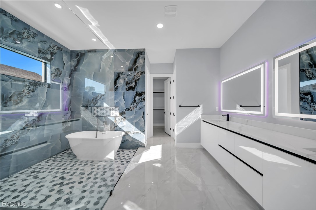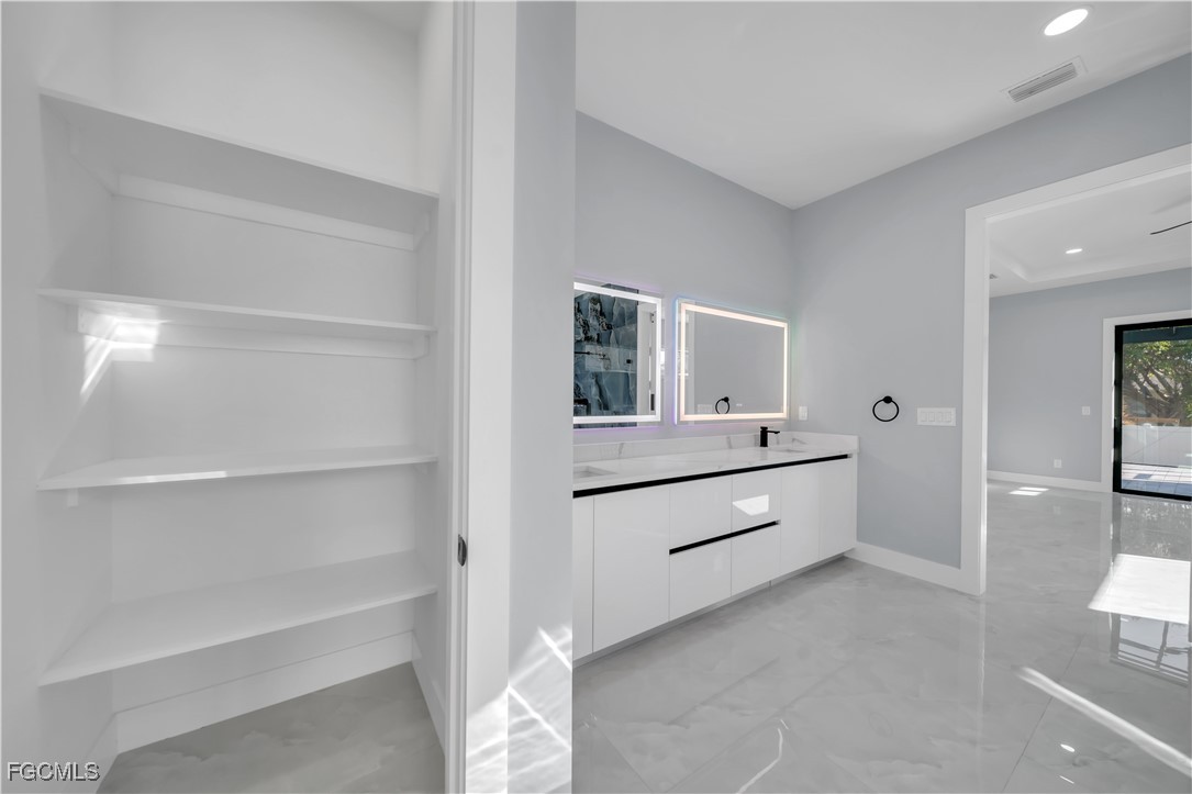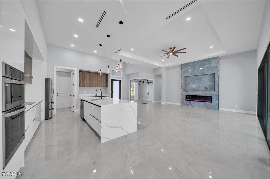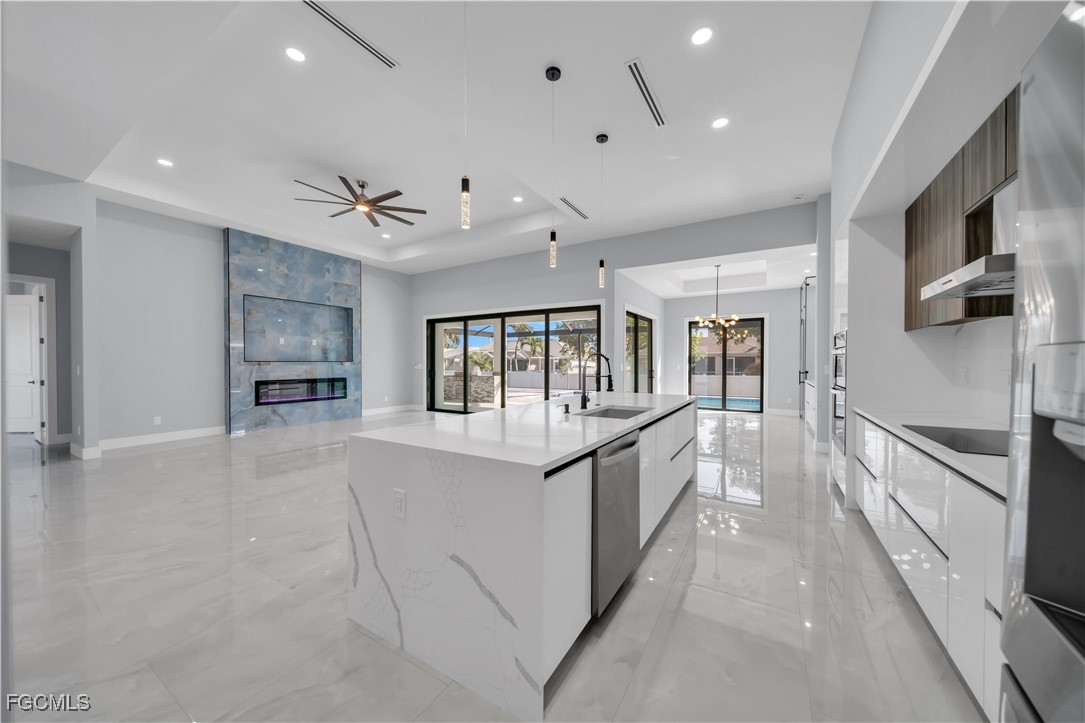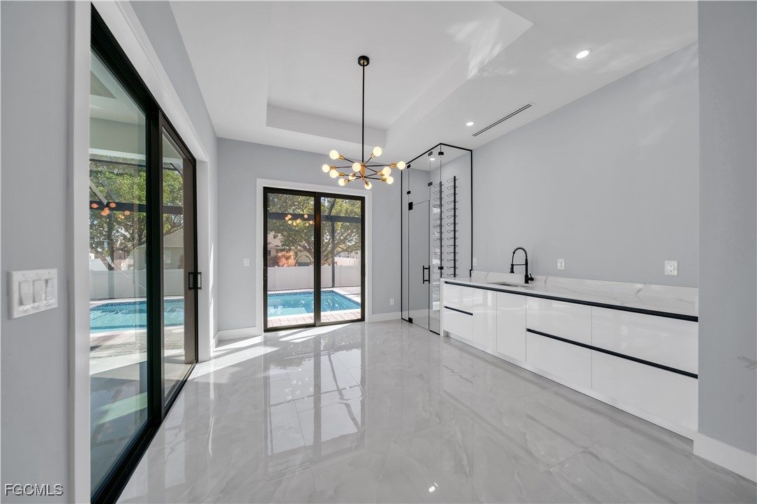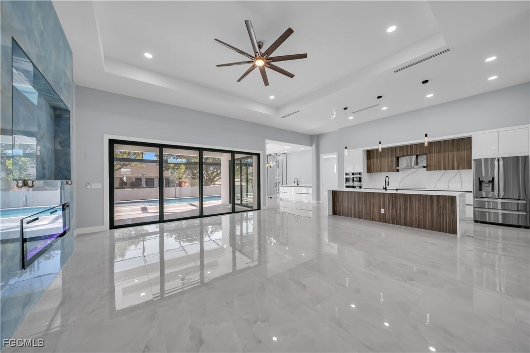 Brand-new 2025 custom pool home offering luxury Florida living with a seamless indoor–outdoor design. Sunset-facing lanai with summer kitchen, resort-style pool, and outdoor living ideal for entertaining. The interior showcases large-format porcelain tile throughout, tray ceilings, a striking modern fireplace, and an open-concept layout filled with natural light. The chef’s kitchen features a waterfall quartz island, premium appliances, wine bar, and coffee bar. A glass-enclosed office adds an upscale, contemporary look while maintaining openness. The primary suite is a true showpiece, featuring a spa-inspired bathroom with freestanding soaking tub, oversized walk-through designer shower, and custom walk-in closet. City water and sewer with all assessments paid. Impact-rated windows and doors and energy-efficient systems.