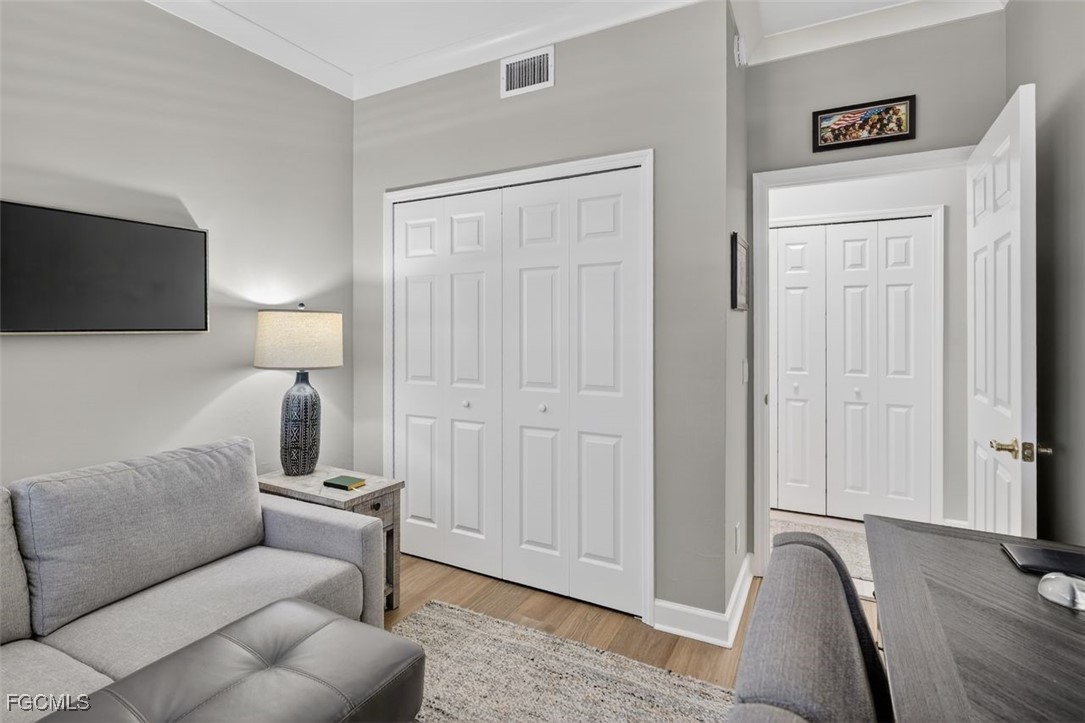 New improved Price! Step into your dream condo featuring 2 beds, 2 beautifully updated baths, and captivating waterfront views all within the 55 and BETTER community of Pelican Preserve! This charming home boasts an updated chefs kitchen designed for cozy meals complete with a table for 2 overlooking the vibrant water wildlife, lush golf course and serene preserve. The large screened lanai extends out allowing for refreshing breezes and prominent views of the herons, ibis, anhinga, egrets, skimmers and the occasional alligator! Recently remodeled in 2025, this stunning condo features a new white kitchen with stainless Frigidaire professional appliances, under cabinet lighting, quartz countertops and travertine tile backsplash. Fresh paint, crown molding and new lighting throughout adding a touch of sophistication to the whole unit. The bedrooms boast engineered hardwood flooring and plantation shutters for easy cleaning and privacy. All of these incredible updates plus a new water heater and hurricane screens for peace of mind and preparedness! Pelican preserve is a premier resort style community offering a guarded gated entrance, Town center with 3 pools, fitness center, tennis, pickleball, restaurants, theatre, card room, walking track, beach area, fishing pier, softball field, theater group, card groups, ceramics, dog park, sidewalks, walking trails through nature preserves and so much MORE!
