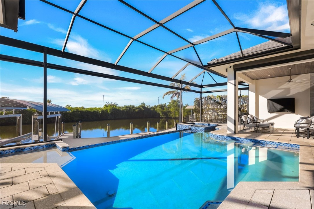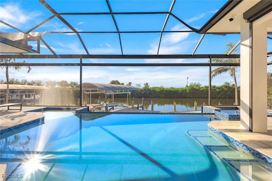 Welcome to a masterfully engineered waterfront estate where European sophistication meets Florida’s premier boating lifestyle. Offered furnished, this exceptional residence showcases uncompromising craftsmanship, intelligent design, and state-of-the-art automation throughout. From the moment you arrive, the new roof, fresh exterior paint, and pristine new cage set the tone for a home that has been meticulously curated and impeccably maintained. Inside, the home unfolds into a refined modern interior featuring all linear air vents, LED lighting throughout, plantation shutters, custom wooden closet shelving, and fully automated electric roll-down shades and shutters. Imported custom glass cabinetry from Germany anchors the home’s sleek aesthetic, paired seamlessly with a top-tier Miele appliance suite, including a built-in coffee system, refrigerator, range, cooktop, steam oven and wall oven, dishwasher, and stainless steel sink liner—delivering a chef’s kitchen that is both elegant and functional. The primary suite is a serene retreat with dual vanities and spa-inspired finishes, while guest accommodations include a Jack-and-Jill pool bath, additional guest bath, and full ADA-compliant accessibility, complemented by advanced foam insulation for superior energy efficiency and sound control. Designed for effortless living, the home features a 5-ton zoned air conditioning system (26 SEER) with four zones, a Stiebel Eltron tankless water heater, solar panels, and low-voltage lighting, ensuring comfort and sustainability year-round. The laundry room includes an Electrolux washer and dryer, utility tub, and custom cabinetry, while the epoxy-finished three-car garage with a separate one-bay space offers an EV charging station. Outdoors, the home transforms into a private resort. A tongue-and-groove lanai ceiling frames an entertainer’s dream with an alfresco grill and Perlick refrigerator, seamlessly connected by dramatic 90-degree sliding glass doors. The heated infinity-edge pool, complete with sun shelf and integrated spa, is heated by both electric and solar systems with smart automation. Boating enthusiasts will appreciate minutes to open water, a 10,000-lb boat lift with canopy and remote, kayak launch with ladder, water at the dock, and raised electrical dock boxes. The spring-fed canals are home to manatees, dolphins, and stingrays, offering a rare waterfront experience. Just around the corner, enjoy tranquil walks and wildlife views at Sirenia Vista Park, while a short drive leads to fine dining, entertainment, and the highly anticipated Seven Islands Project. Every detail—from TOTO toilets to the fully automated smart-home system—reflects a commitment to luxury, performance, and lifestyle. Schedule your private showing today and experience elevated Cape Coral waterfront living.
