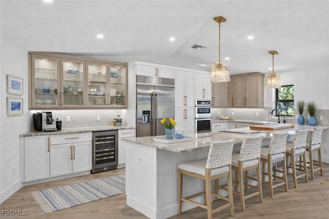 Completely reimagined and thoughtfully redesigned, this Sanibel home blends refined style with relaxed coastal living. At its heart is a showstopping kitchen designed by a professional chef to serve as both a high-functioning culinary workspace and a natural gathering hub. The expansive 16-foot island, illuminated by Restoration Hardware pendants, invites conversation and lingering evenings, perfect for beautifully arranged hors d’oeuvres and a glass of wine with friends. Natural, one-of-a-kind quartzite countertops add luxurious texture and durability, while Jenn Air appliances — including a sleek induction cooktop — deliver elevated performance. A beverage station and coffee bar with glass-front cabinetry, LED lighting, and a built-in wine cooler add both sophistication and convenience. The efficient work triangle ensures cooking is as enjoyable as dining. Wide-plank luxury vinyl flooring runs continuously throughout, intentionally installed without threshold breaks to create a clean, expansive feel. Vaulted ceilings in the great room enhance the sense of openness, while energy-efficient LED puck lighting provides a warm, modern glow. New interior doors and refined trim details complete the home’s crisp, updated finish. A dramatic wall of new impact-rated sliding glass doors frames one of the most captivating views on the island. The Sanibel River shimmers with mangroves and vibrant wildlife, while beyond it the rolling emerald fairways of multiple holes at the Sanibel Island Golf Club create a rare and picturesque backdrop. Subtle glimpses of the Gulf remind you just how close the shoreline is. The reimagined primary suite is a private sanctuary with serene views through an expanded picture window, two walk-in closets, and a spa-like bath. Timeless white shaker cabinetry, an oversized vanity, and a spacious frameless glass-enclosed shower create a bright, calming retreat. Outdoors, a fully rebuilt pool with new shell, finish, tile, and equipment — a $60,000 investment — anchors your private oasis. A new pool fence and no-see-um screens on the lanai allow for comfortable outdoor living day and night. Major upgrades provide lasting confidence, including a new roof (2024), all new impact-rated windows and doors (2024), a hurricane-rated garage door, three new A/C units, and a Culligan water purification system. Located directly across from the beach with deeded access and parking, spontaneous sunset walks and Gulf swims are part of daily life. Also nearby are golf, tennis, pickleball, and multiple beachfront dining options. This is more than a beach home; it’s your place to unwind, reconnect, and savor Sanibel every day.