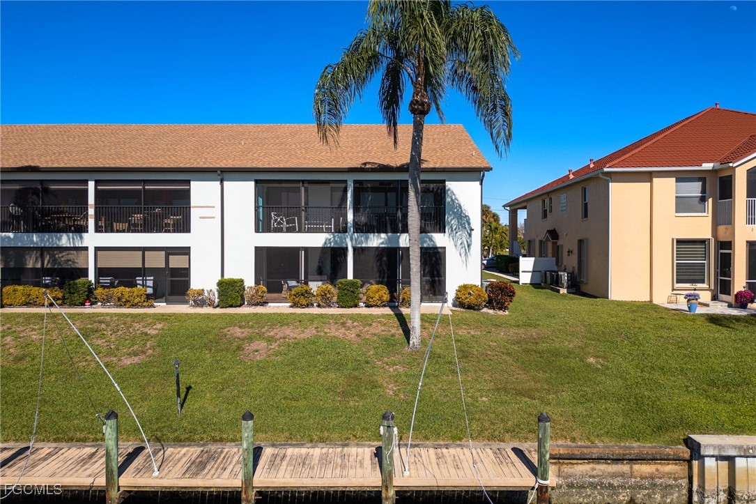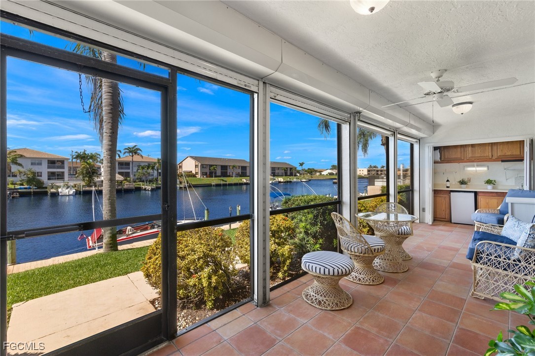 Turnkey, first-floor end-unit condo sits on the Rubicon Canal with beautiful water views and quick Gulf access (just one bridge!). Fully furnished and move-in ready, this 3 bedroom, 2 bath gem features a bright, open layout with a coastal kitchen showcasing white shaker cabinets, quartz countertops, stainless appliances, and a farmhouse sink. The living space is light and airy with sliding glass doors overlooking the water, while the split-bedroom floor plan offers privacy for guests and a spacious primary suite with lanai access, walk-in closet, and updated en-suite bath. The expansive lanai is complete with a wet bar and mini fridge, making it perfect for morning coffee or sunset cocktails as boats cruise by. Located in Rubicon Vista, a desirable 55+ community, enjoy a heated pool, boat docks (first come, first served), storage for beach gear, electric hurricane shutters, and low-maintenance tile and laminate flooring throughout. No pets, but plenty of perks! Just bring your flip-flops and start living the Florida lifestyle.