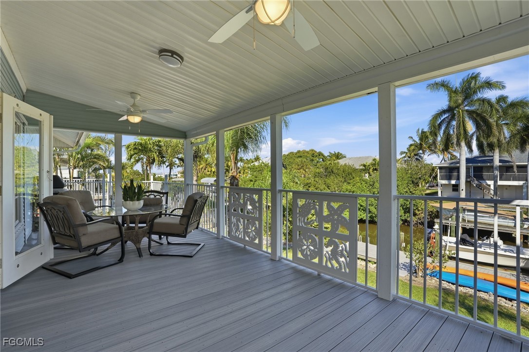 The living area opens to an upper lanai with composite decking and a custom designer coastal railing overlooking the water. This elevated outdoor space is ideal for sunrise mimosas and sunset cocktails, watching boats pass by, or spotting dolphins and manatees from your own backyard.