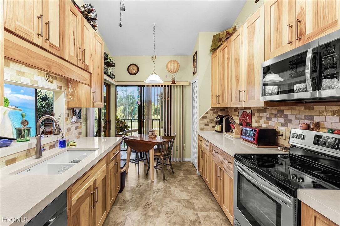 Welcome to this beautifully FULLY REMODELED 3 BEDROOM 2 BATH home with an ATTACHED GARAGE, ideally located in the GOLF COMMUNITY OF EAGLE RIDGE in the heart of Fort Myers. This home has been thoughtfully updated throughout, featuring BRAND NEW cabinetry and countertops in both the kitchen and bathrooms, all NEW FLOORING along with modern finishes that create a fresh, move-in-ready feel. A major highlight of the home is the IMPACT WINDOWS THROUGHOUT providing added safety, energy efficiency, and peace of mind. Relax and take in the serene surroundings from the GLASSED IN PORCH overlooking the NUMBER 4 TEE BOX, LAKE AND GOLF COURSE, offering picturesque views and an ideal space for year-round enjoyment. Enjoy the COMMUNITY POOL which is just steps away! CENTRALLY LOCATED, this home provides quick access to the INTERNATIONAL AIRPORT, shopping, dining, medical facilities, beaches, and major roadways, making it perfect for full-time or seasonal living. Enjoy the best of Fort Myers living with scenic views, modern updates, and an unbeatable location—schedule your private showing today!
