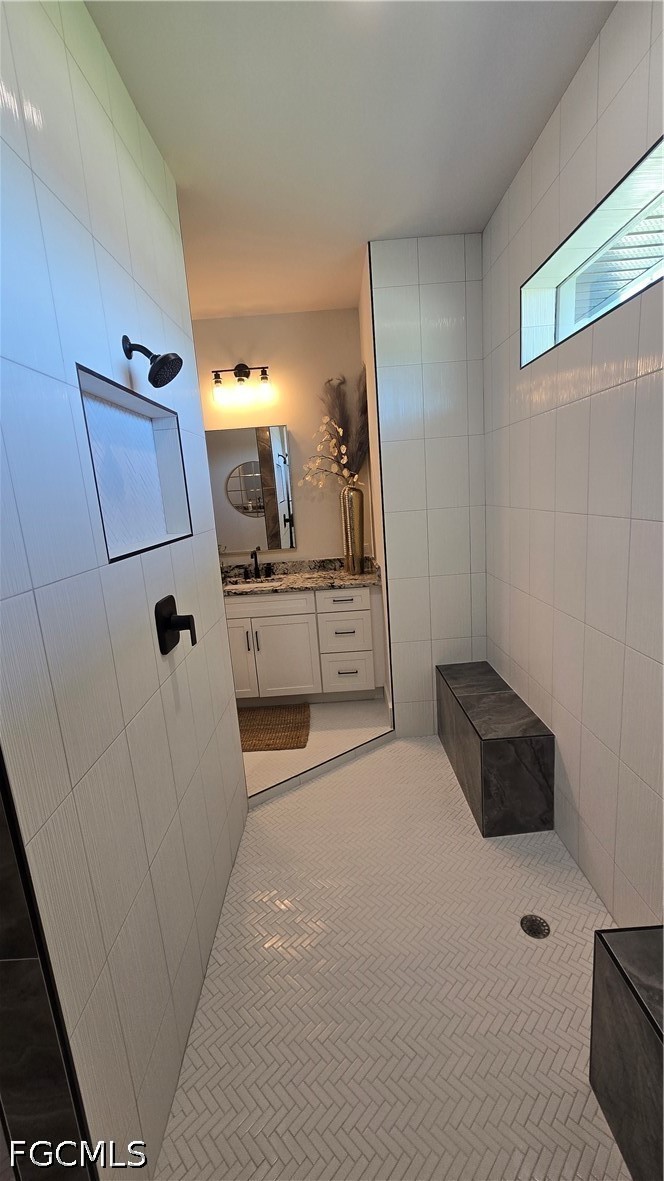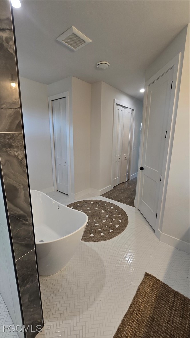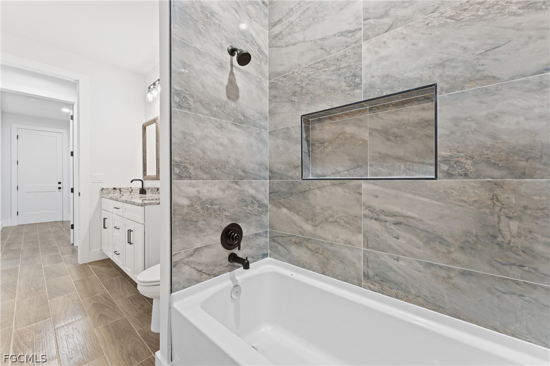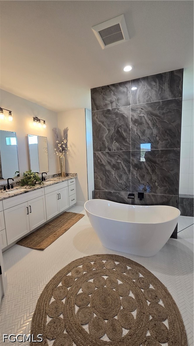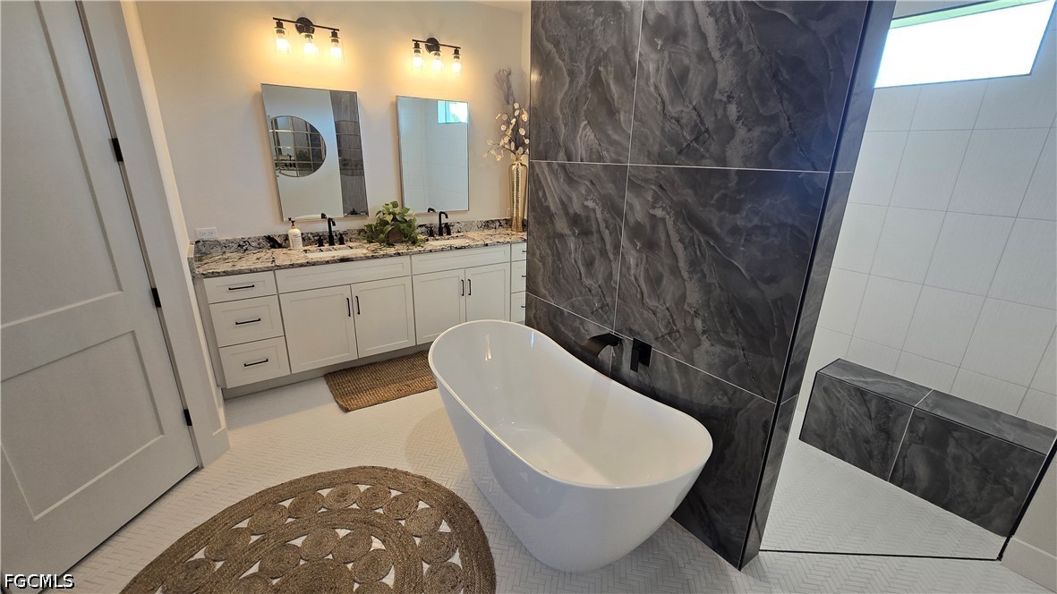 The home offers cathedral ceilings, 8-foot doors, and a grand, open layout. The primary suite includes his-and-hers custom walk-in closets. The primary bathroom features a walk-through shower, freestanding tub with a floor-to-ceiling accent wall, and an oversized vanity with ample storage.