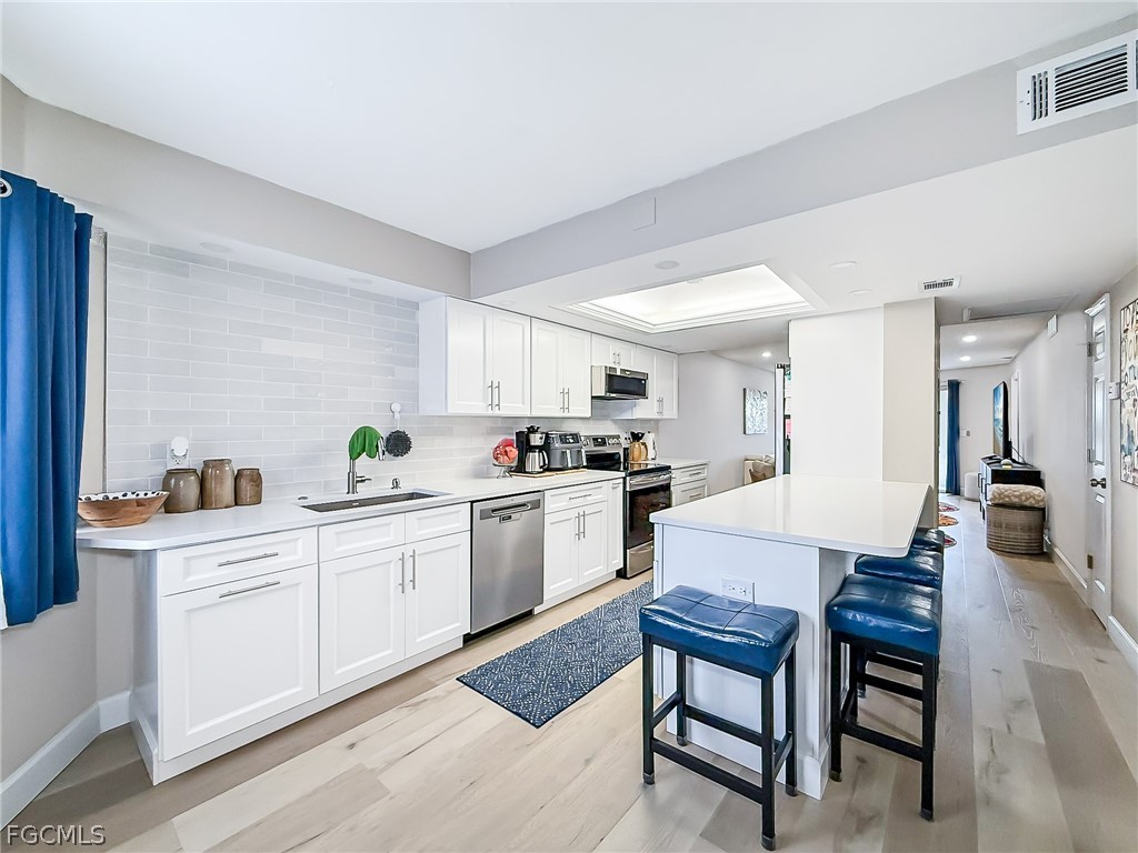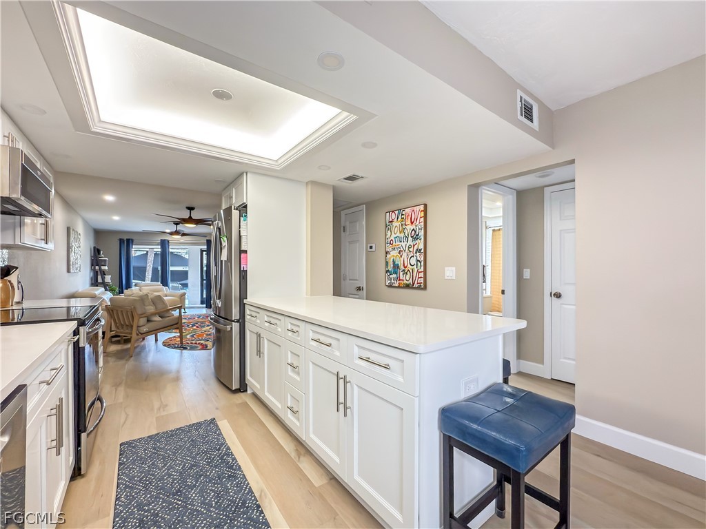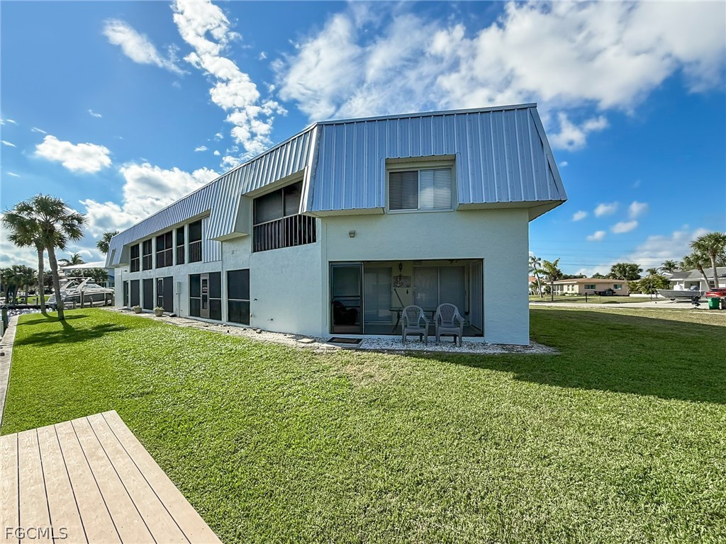 SAILBOAT ACCESS!! END UNIT!! BOAT DOCK!! This completely fashionably renovated unit has 2 bedrooms 2 baths and a boat dock directly in front of your lanai! Roughly 25 minutes by boat to the Caloosahatchee River, this condo is a boater's dream location. Situated near downtown Cape Coral where all the shopping, restaurants and nightlife are located, it is also 2 canals from the Bimini Basin project under construction at this time. Additionally, it is also across the canal from the approximately 40 acres site that the city has purchased for demolition and redevelopment making this an ideal purchase for not only personal enjoyment but as an investment. A complete remodel done in 2024, all new appliances, a new A/C condensing unit installed in July of 2023 with a 10 year transferable warranty and impact resistant windows and doors. New exterior paint and repairs completed end of Feb. 2024 and new flood gates installed on each door in 2025. Every realtor says their listing is a "must see", but this one really is.a must see.