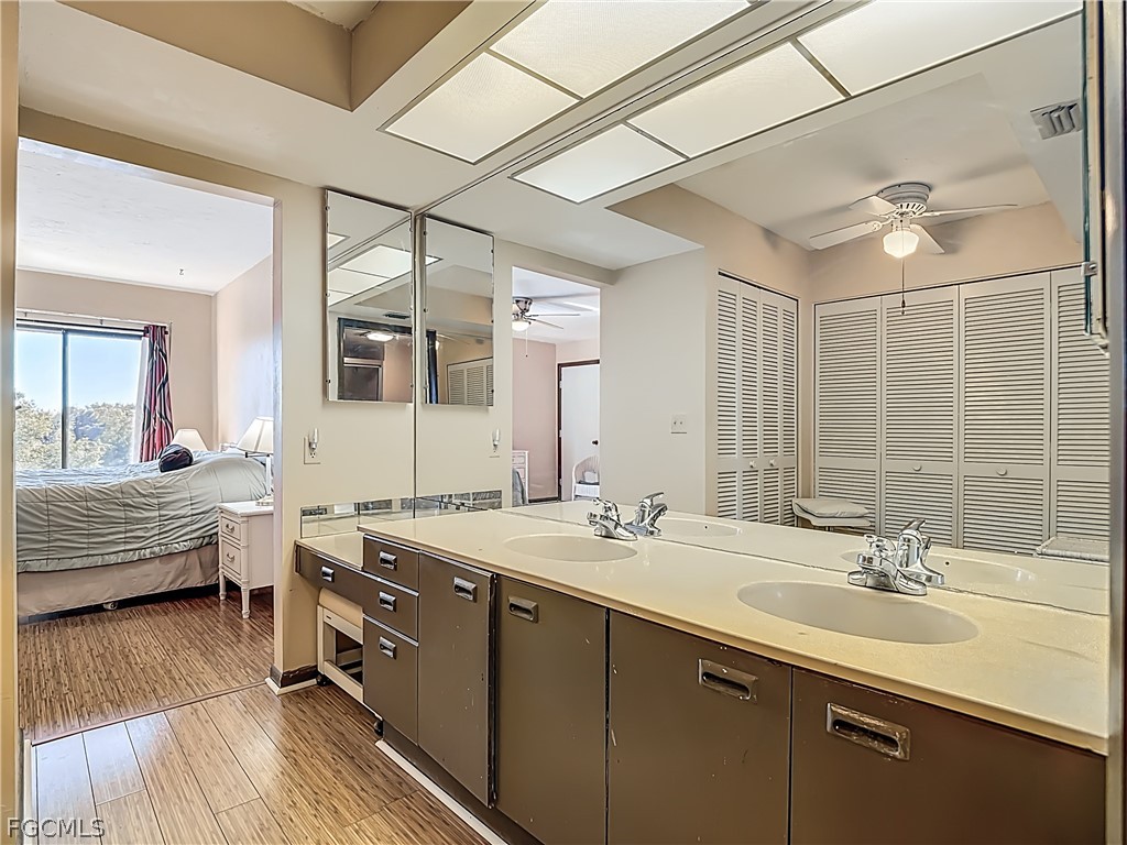 The spacious living and dining area opens to a screened lanai overlooking the lake — a peaceful setting with strong upside potential. The split-bedroom floor plan provides privacy, and both bedrooms are generously sized with ample storage.