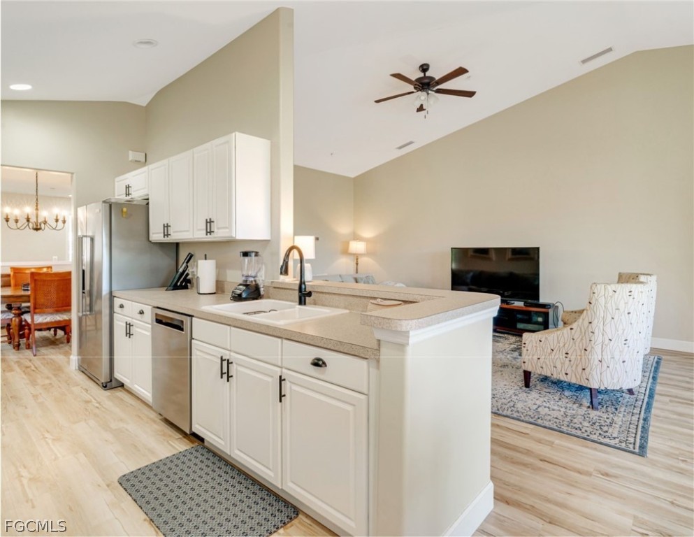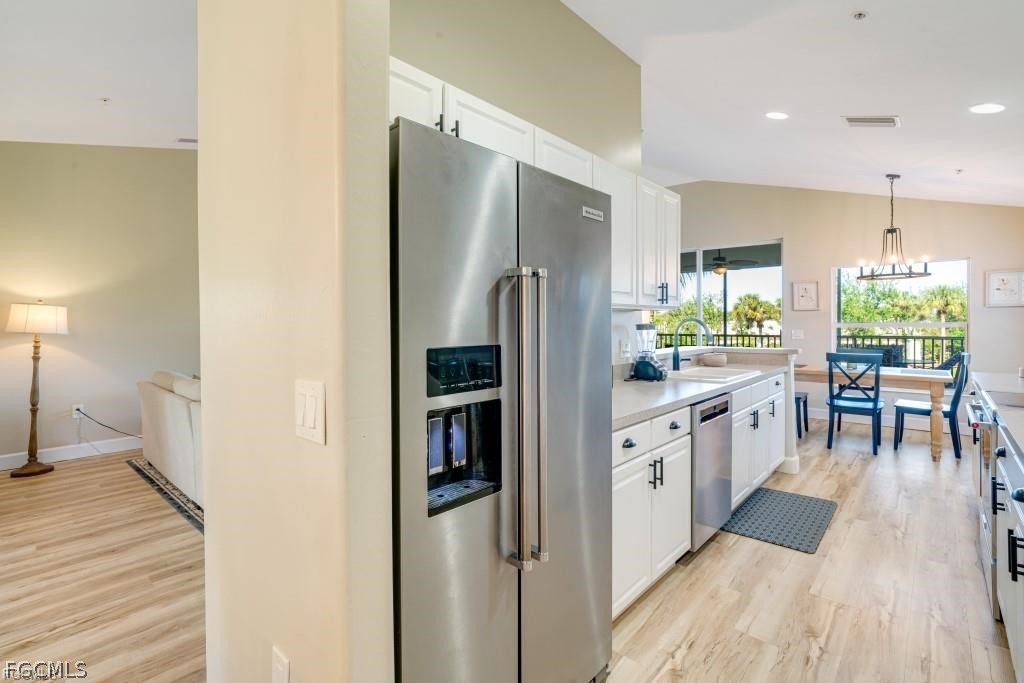 This bright, turn-key corner residence features a spacious and flexible floor plan with 2 bedrooms plus a den (or optional third bedroom), 2 bathrooms, and an attached 1-car garage. The thoughtfully designed split layout provides both privacy and comfort, while vaulted ceilings and abundant windows fill the home with natural light and showcase peaceful lake views.