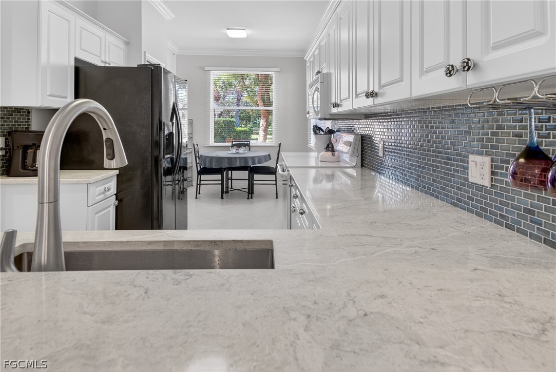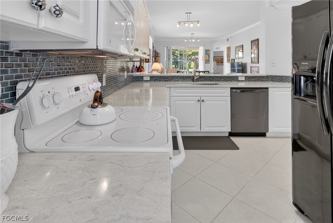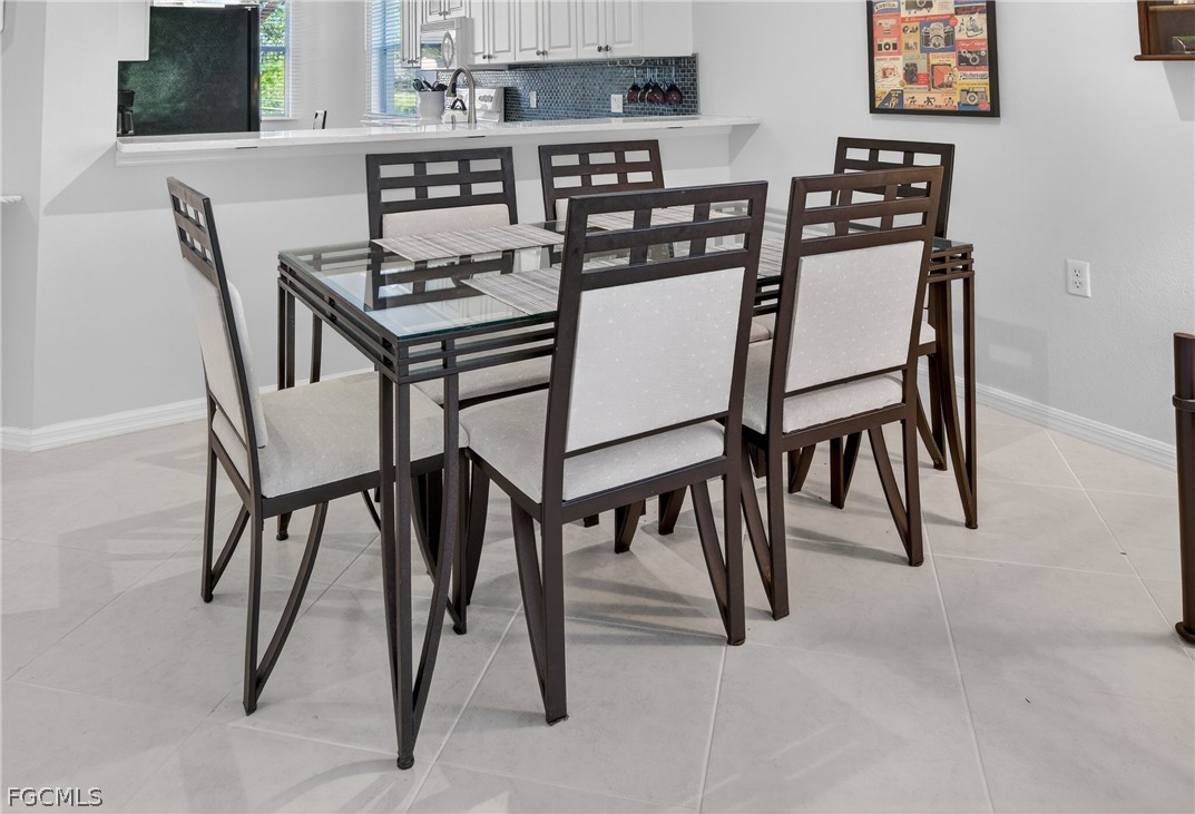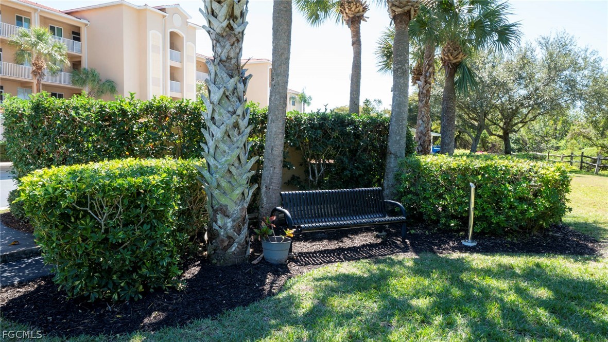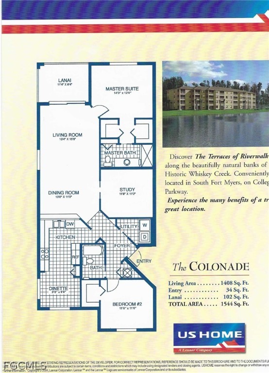 WOW! Rarely available end unit with extra windows for lots of natural light, a stunning lake view from the lanai, and located on the ground floor (no stairs needed ever) can be yours in the wildly popular Terraces at Riverwalk community, conveniently located within walking distance of medical offices, shopping & dining, and a short drive to the beaches of SWFL. This open concept, updated & fully turnkey unit with split bedroom floorplan can be your slice of paradise, offering: a massive eat-in quartz kitchen with glass tile backsplash, pantry, breakfast nook, & long bar for entertaining friends & family, living/dining area including large window & slider leading to the screened lanai overlooking the lake, primary bedroom with ensuite shower bath & dual walk-in closets, generously sized 2nd bedroom also with walk-in closet, bonus room off living/dining area for den, office or dining with pocket doors, interior laundry room, 2nd bath with tub/shower combo, easy care ceramic tile installed on the diagonal throughout public areas & newer plush carpet in the bedrooms & den, newer water heater & dishwasher, assigned covered parking as well as plenty of guest parking, and large outdoor storage room conveniently located just outside your front door. The furnishings are sleek & modern including brand-new king-size bed in the primary suite, king-size bed in the 2nd bedroom, 2 twins & desk in the den, and leather couch & recliner in living area with durable metal & glass dining set, end tables, & coffee table. No flooding from hurricanes Ian, Milton or Helene. The Terraces at Riverwalk is a lovely community offering a clubhouse with meeting space & work-out room, large outdoor pool with spa, BBQ grills, and is expertly maintained with new wind mitigated roofing & exterior painting in 2023, the reserve study completed in 2024, and is located in unincorporated Lee County, meaning no CDD or city taxes. Information is expected to be accurate, but Buyers should always perform their own due diligence. Wall art in living area is excluded. Sound board, espresso machine, and keurig belong to tenant.