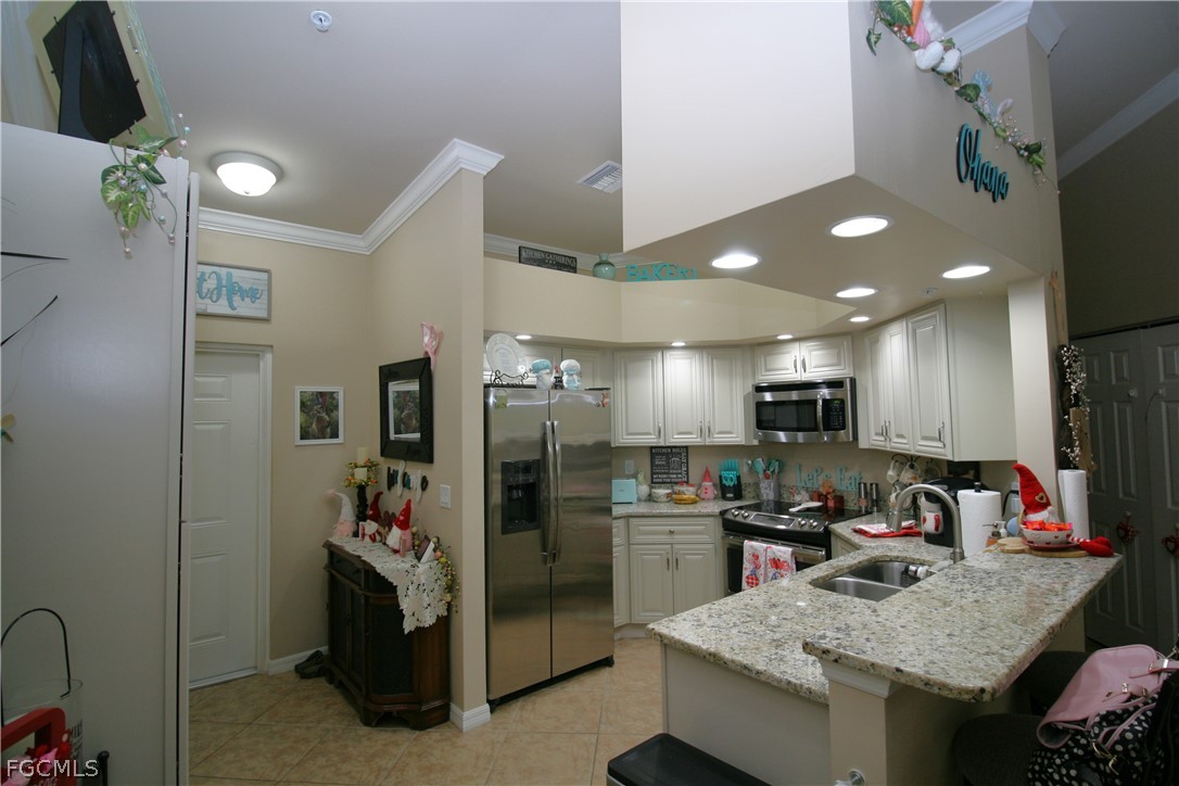 The kitchen features upgraded light wood cabinetry, granite countertops, stainless steel appliances, and a built-in pantry cabinet for added storage and style. The spacious open-concept great room offers high ceilings, crown molding throughout, and serene views of a wooded preserve—creating a peaceful, private backdrop to enjoy daily.