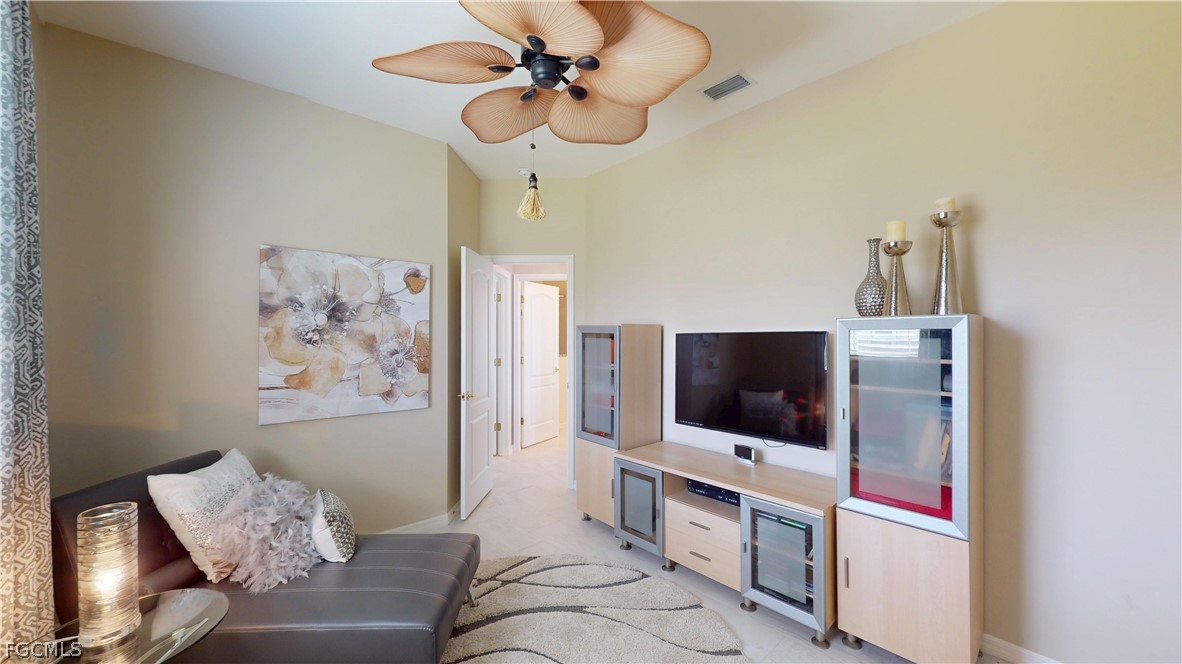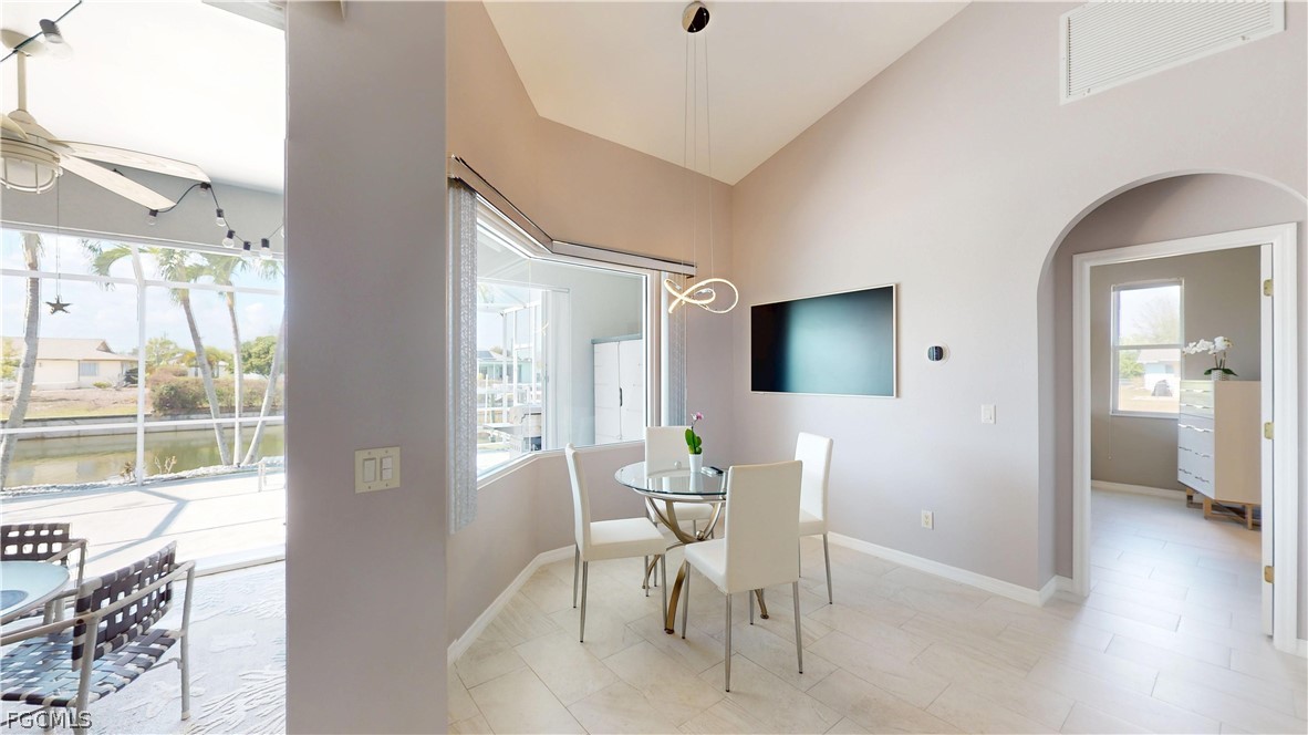 Situated on an oversized triple lot with approximately 120 feet of seawall, this property offers exceptional outdoor space and privacy. Sliding glass doors open to the screened lanai overlooking a wide, serene canal with direct access to all seven lakes, perfect for boating, kayaking, and enjoying Southwest Florida’s waterfront lifestyle. Boaters will appreciate the private dock and 7,000-pound boat lift, making time on the water effortless.