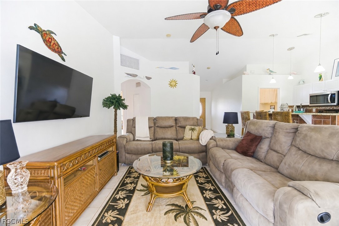 * HEATED SALTWATER POOL. * Desirable corner lot in NW Cape Coral, this well-maintained home offers 3 bedrooms plus a den, 2 bathrooms, and a bright, open layout with soaring ceilings and tile throughout all main living areas. Being sold TURNKEY, No Flood Insurance Needed and ready for you to call it HOME!