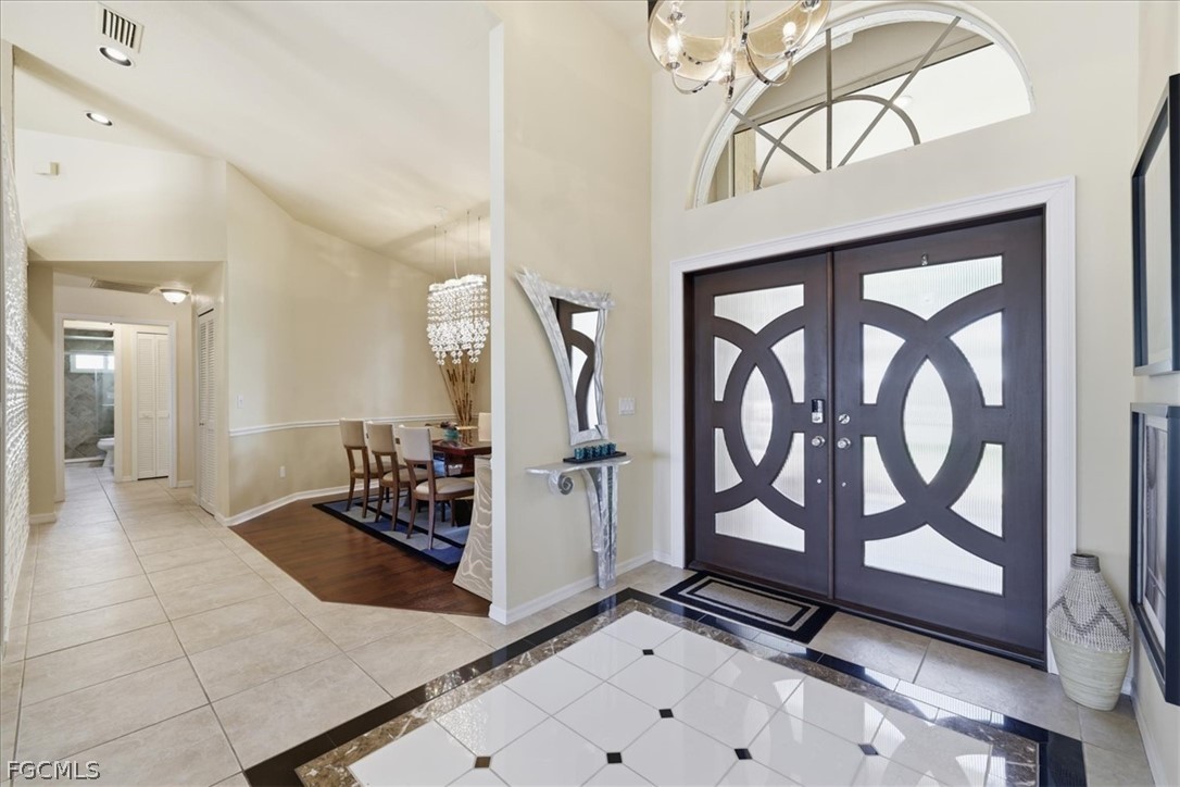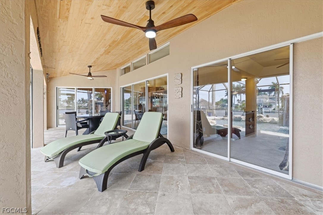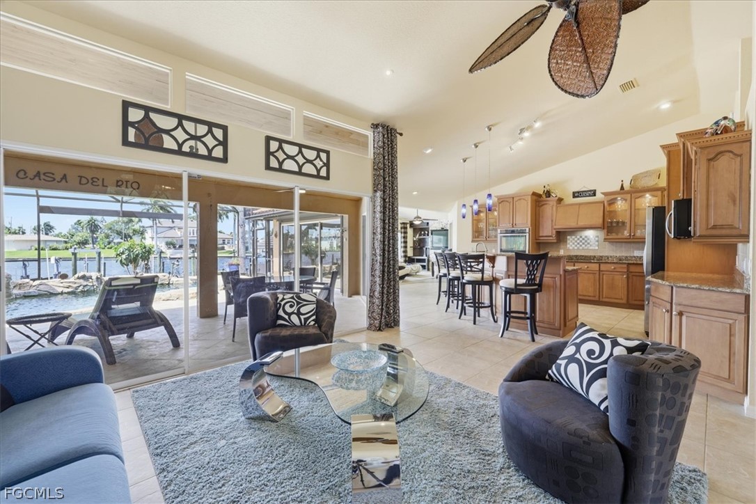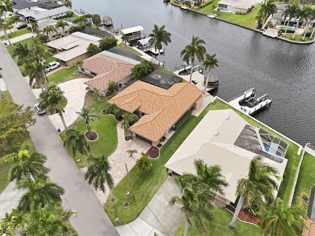 Welcome to refined waterfront living in one of Cape Coral’s most sought-after neighborhoods. This exceptional residence offers over 2,400 square feet of beautifully designed living space with an expansive open-concept floor plan that seamlessly blends comfort, style, and effortless entertaining. Step outside to your own private resort-style oasis. The sparkling pool with a dramatic grotto and cascading waterfall creates a tranquil tropical retreat, while the convenient pool bath makes outdoor living and entertaining effortless. Whether hosting gatherings or enjoying a quiet afternoon poolside, this space is designed to embrace the Florida lifestyle. Boating enthusiasts will appreciate the brand-new dock complete with a boat lift and jet ski lifts, offering easy access to the water for days spent exploring Southwest Florida’s beautiful waterways. With no bridges to open water, boaters have the freedom to accommodate larger vessels with ease. The dock also features a charming tiki hut which is perfect for relaxing, entertaining, or unwinding with a drink while taking in breathtaking Florida sunsets. This home offers exceptional peace of mind with numerous recent upgrades, including a new metal tile-like roof (2023), new water heater (2023), impact-resistant/low E windows (2022), hurricane-rated garage door, new dock decking (2025), new paver patio & retaining wall (2025), new Generac generator hookup to electric system (2023) and fresh professional landscaping. Ideally located just minutes from the shopping, dining, and entertainment of downtown Cape Coral, this property perfectly captures the essence of luxury waterfront living where elegance, comfort, and the boating lifestyle come together.