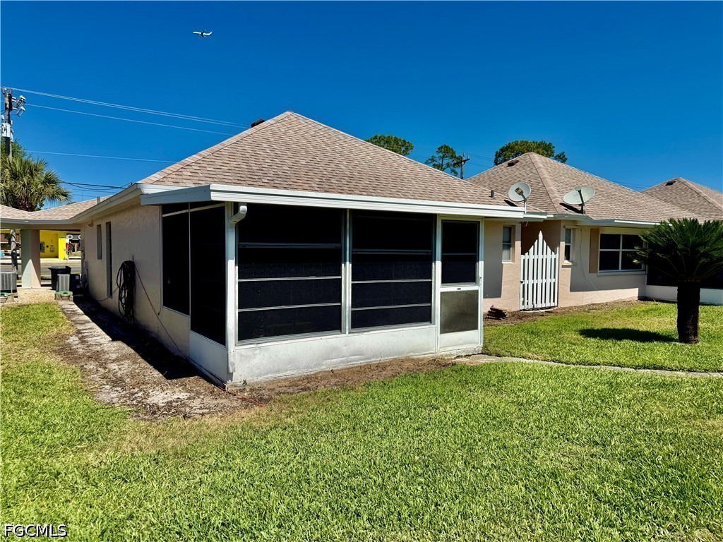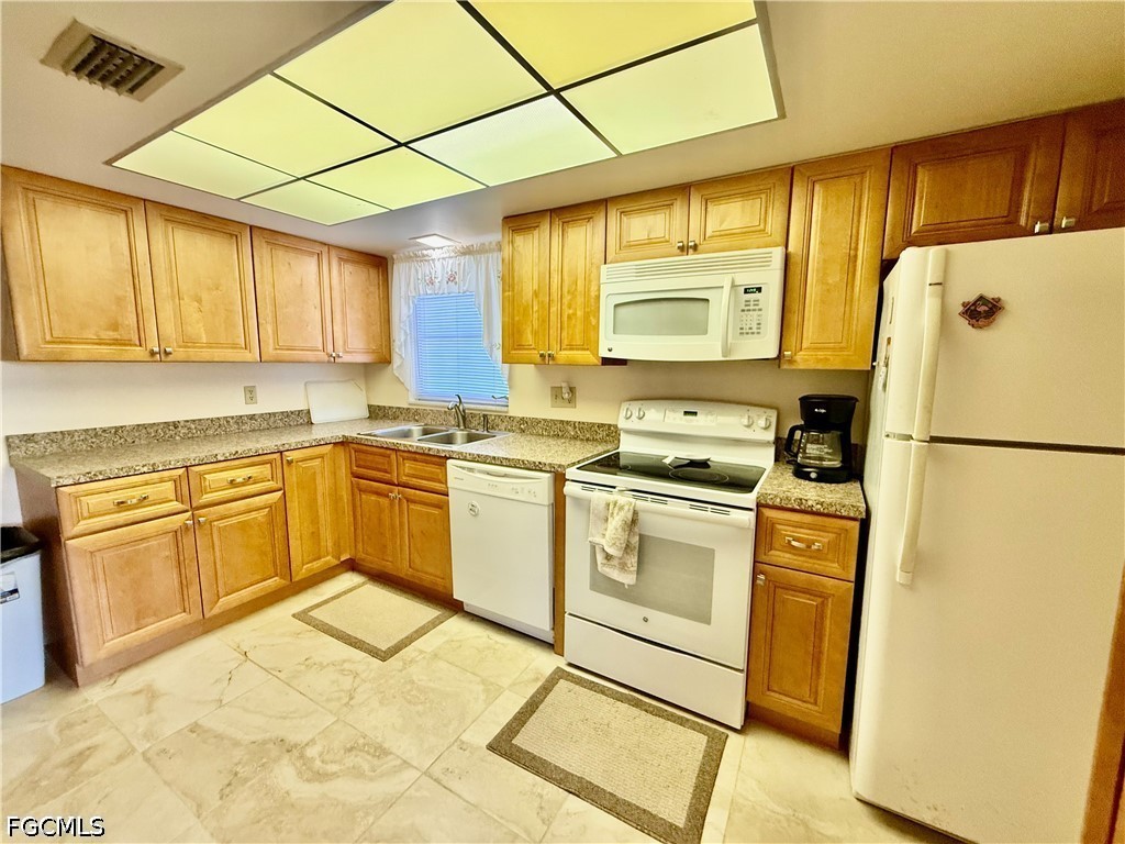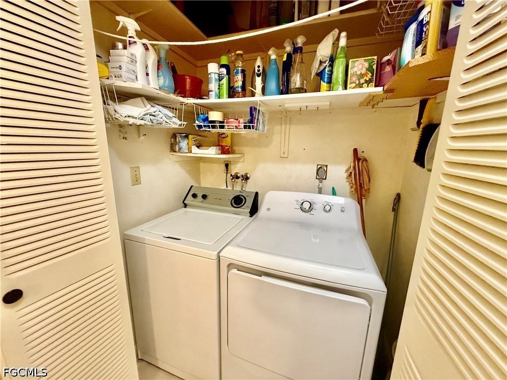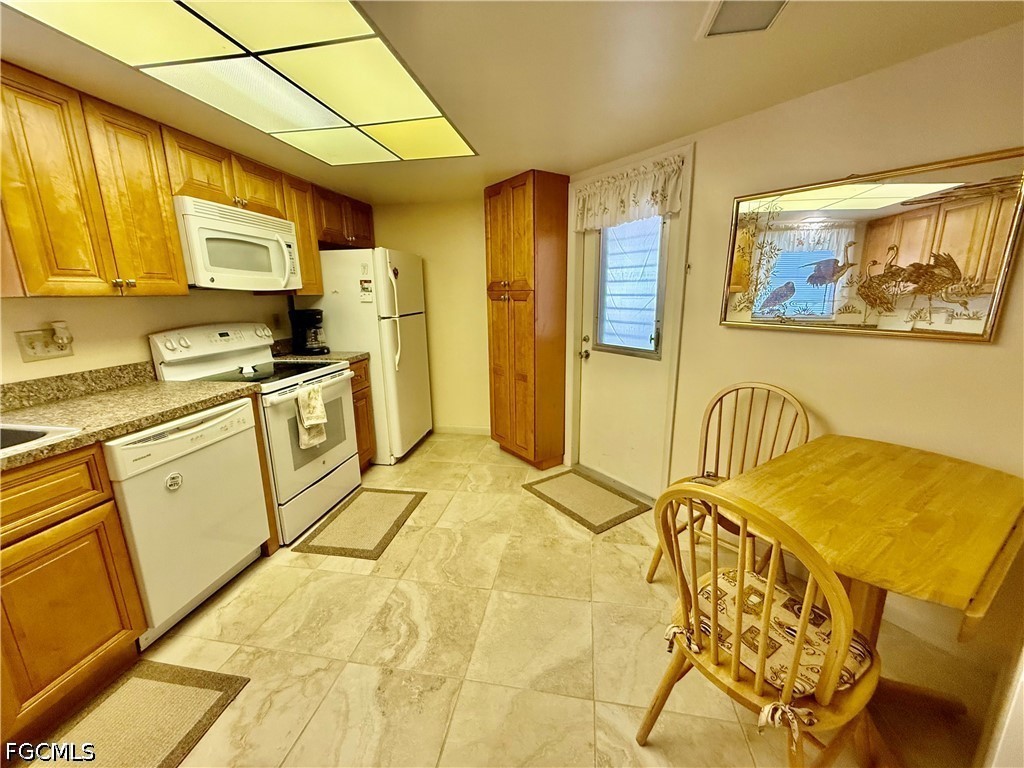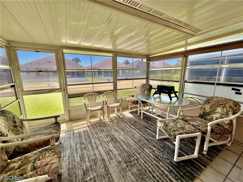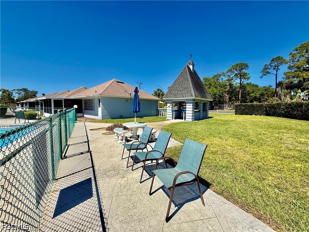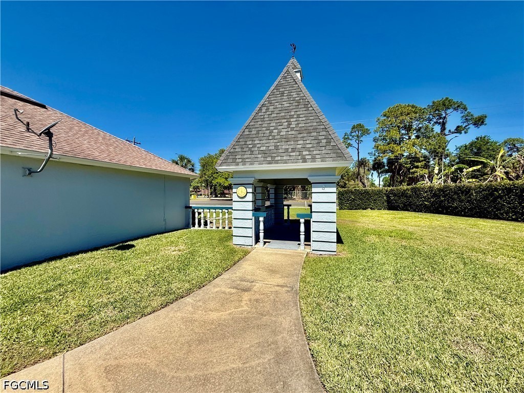 Popular Village International Condo Assn, 2 bedroom 2 bath with covered carport parking, NEW DIMENSIONAL SHINGLE ROOF IN 2023, NO AGE RESTRICTIONS HERE AND PETS OK, NEW WATER HEATER IN 2021, You'll feel right at home in this well maintained villa, 14 X 10 screened lanai enclosed with vinyl windows for weather protection, updated eat in kitchen with newer solid maple cabinets, soft close doors and drawers, pantry, all appliances are included, indoor laundry area with full size washer and dryer, primary bedroom with walk in closet and ensuite bath with walk in shower and large vanity, two new higher commodes in bathrooms, newer ceramic tile floors in all wet areas, guest bedroom located in front with guest bathroom for privacy, covered carport parking plus additional space for two more cars, lanai overlooks the beautifully landscaped courtyard area with shuffleboard, Gazebo and common HEATED POOL, CENTRAL WATER AND SEWER, quiet neighborhood in front of Country Club Estates, excellent for evening or morning walks, easy access to I-75, Ft Myers and The SWFL International airport. Lehigh is the highest elevation in the Lee County. NO FLOOD INSURANCE REQUIRED.