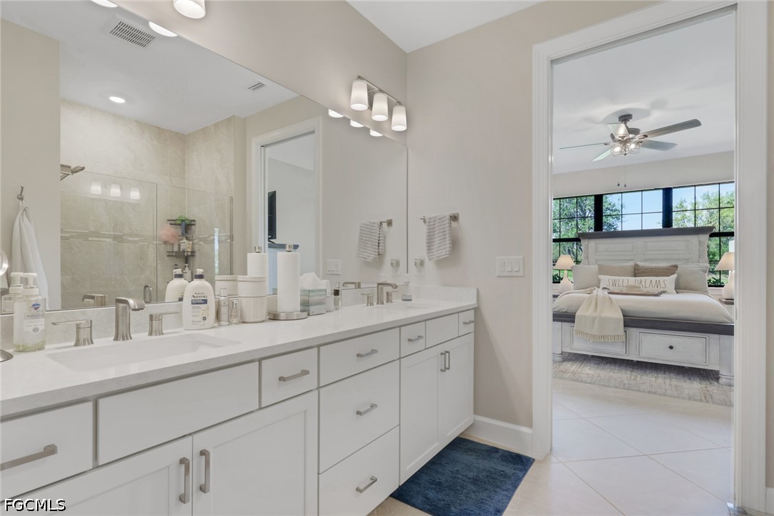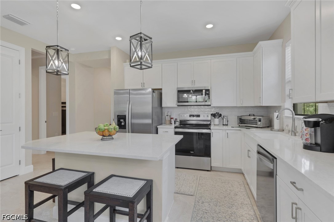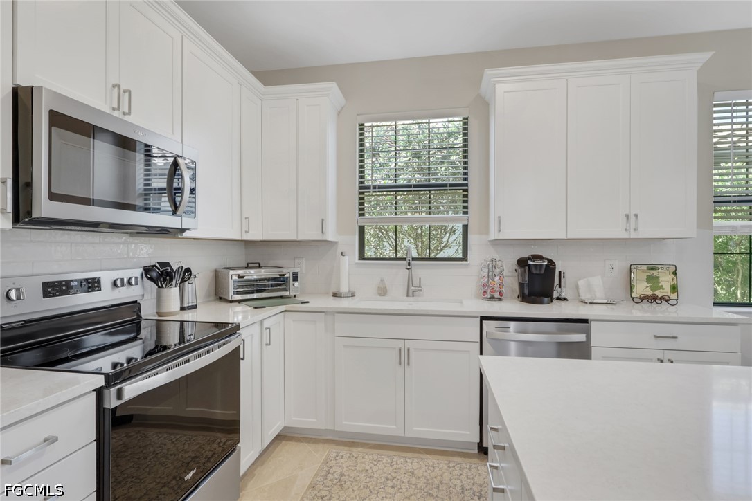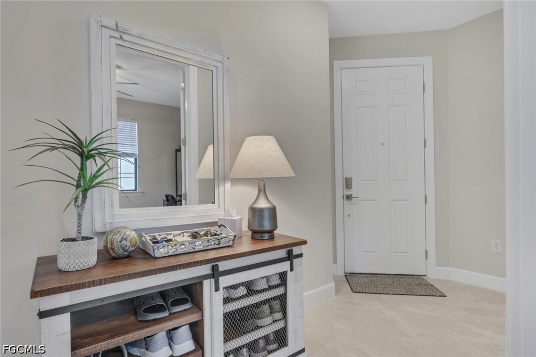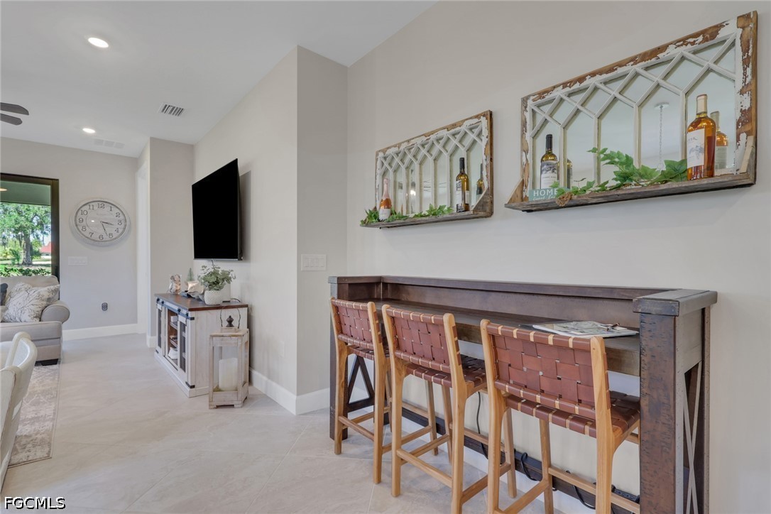 Welcome home to your better than new "SMART" villa in River Hall Country Club. This Ellenwood villa has been ABUNDANTLY upgraded and shows like a model home. The minute you enter the home your eyes will be drawn to all the upgrades. Impact windows and doors provide additional security. There is tile flooring throughout all rooms. The kitchen has upgraded stainless steel appliances, upgraded quartz countertops, a stylish backsplash, and soft close cabinets. Custom blinds, designer lighting fixtures and 4 ceiling fans complete the home and tie everything together. The home has also been professionally painted. The private lanai with a NE exposure is situated perfectly on the 18th green so you can comfortably enjoy the sights and sounds of Southwest Florida while relaxing and watching golf. The time, thought, and expense of the upgrades make this home a steal at $359,900. The Rolling Rock neighborhood is a highly sought-after neighborhood as it hosts weekly golf, bocce ball and pickleball leagues for Rolling Rockers. Plus, they have an annual golf tournament complete with a pre-tournament team party at the Bunker Bar. River Hall Country Club offers the Members Only Bunker Bar and Caloosa Grill for dining options. River Hall CC members have access to the heated zero entry lagoon style pool at the Bunker Bar that is just a short walk away. The Town Hall Amenity Center is located at the front gate. It has pickleball, bocce ball and tennis sport courts, full fitness center including rooms for yoga, Pilates and private massage rooms. There is also a large resort pool, outdoor play area, billiards, pool side seating and much more. There is a full time activities director always planning new events. River Hall Country Club is an 18-hole Davis Love III designed bundled golf community that is conveniently located between 2 airports and short drive to the eclectic Downtown Ft. Myers River District. Whether you are a snowbird or full-time resident, this maintenance free "move in ready" villa in a fabulous golf community is simply perfect. The furniture is negotiable.