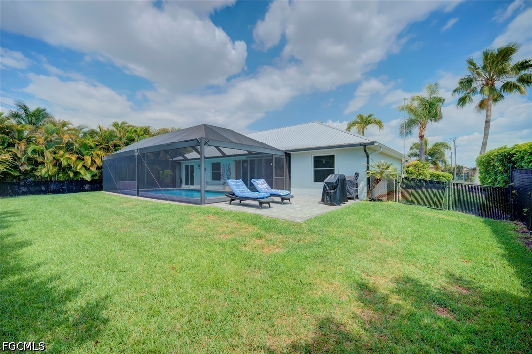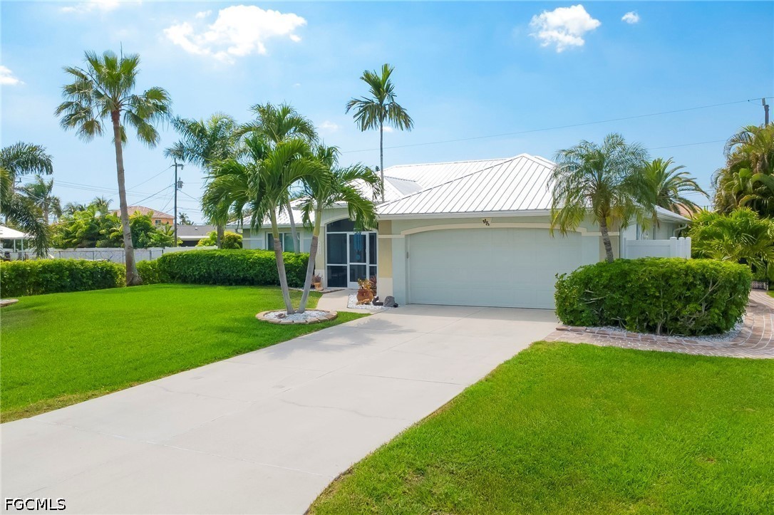 BEAUTIFULLY UPDATED SALTWATER POOL HOME ONLY 1.2 MILES FROM CAPE HARBOUR! This meticulously maintained 3 bedroom, 2 bathroom pool home in Cape Coral offers the perfect blend of comfort, style, and Florida outdoor living—all just minutes from Cape Harbour Marina and its popular waterfront restaurants, shopping, and entertainment. With manicured landscaping, a screened-in front porch, and a serene setting, this home delivers both curb appeal and everyday functionality. Inside, the thoughtfully designed SPLIT FLOOR PLAN provides privacy and easy living, complemented by abundant natural light and seamless indoor-outdoor flow to the pool area. The home has been beautifully updated with ALL NEW IMPACT WINDOWS AND DOORS, a METAL ROOF, NEWER A/C AND HOT WATER HEATER (2020), and modern finishes throughout, offering peace of mind and move-in-ready convenience. Step outside to your private backyard retreat featuring a NEWLY RESURFACED SALTWATER POOL, NEW PANORAMIC POOL CAGE, and a spacious covered lanai perfect for entertaining or relaxing. The OUTDOOR KITCHEN with griddle and mini fridge creates the ultimate space for hosting family and friends while enjoying the Southwest Florida lifestyle. Additional highlights include lush, manicured landscaping and palm trees, inviting outdoor spaces, and a prime location placing waterfront dining, boating, and entertainment just minutes away.